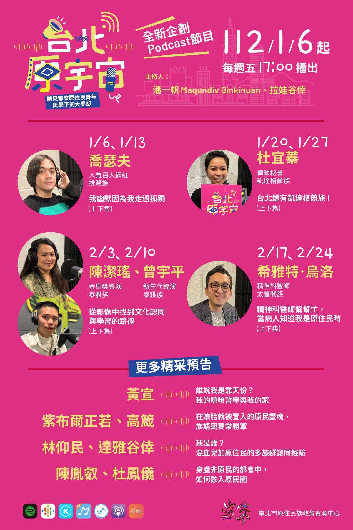 一、為擴大都會區原住民年輕學子在求學期間及社會適應之正面影響力,本中心製作「台北原宇宙-Podcast節目」(以下簡稱本節目),訪談臺北市原住民青年學子成長學習經驗,並以輕鬆逗趣的故事分享,帶出感動人心的正向思考能量。
