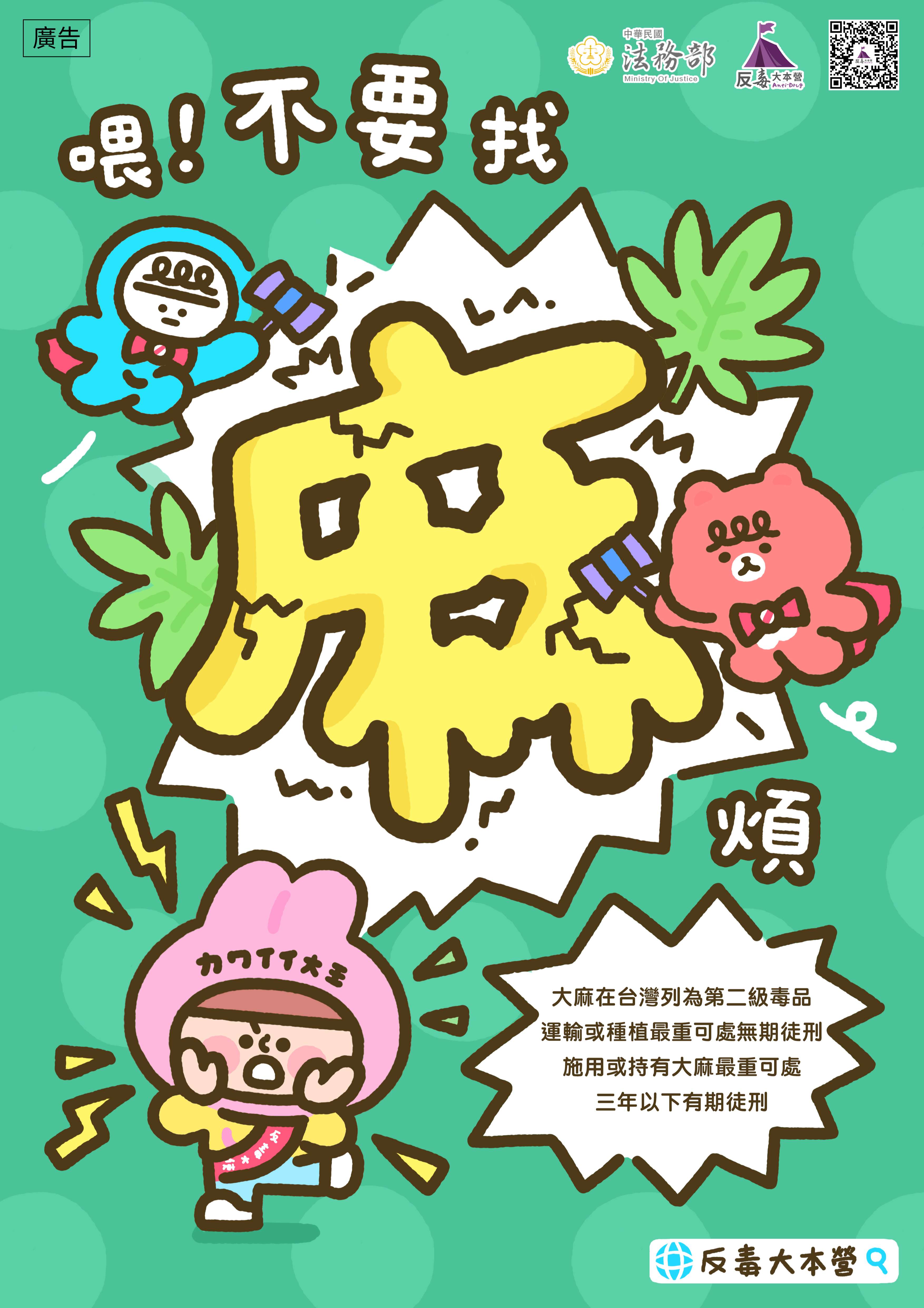 為落實行政院新世代反毒政策,提升民眾對於新興毒品及大麻議題之關注,法務部與插畫家weiweiboy合製影片2部及文宣: