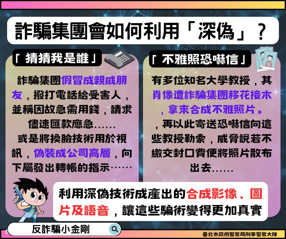 隨著人工智慧發展,「深僞(Deepfake)」技術恐遭有心人士利用於假訊息、影片、語音等媒體素材合成製作,達到「換臉、變聲」等效果,甚至用於強化詐欺手法的擬真性,令民眾難辯真偽,因而受騙。