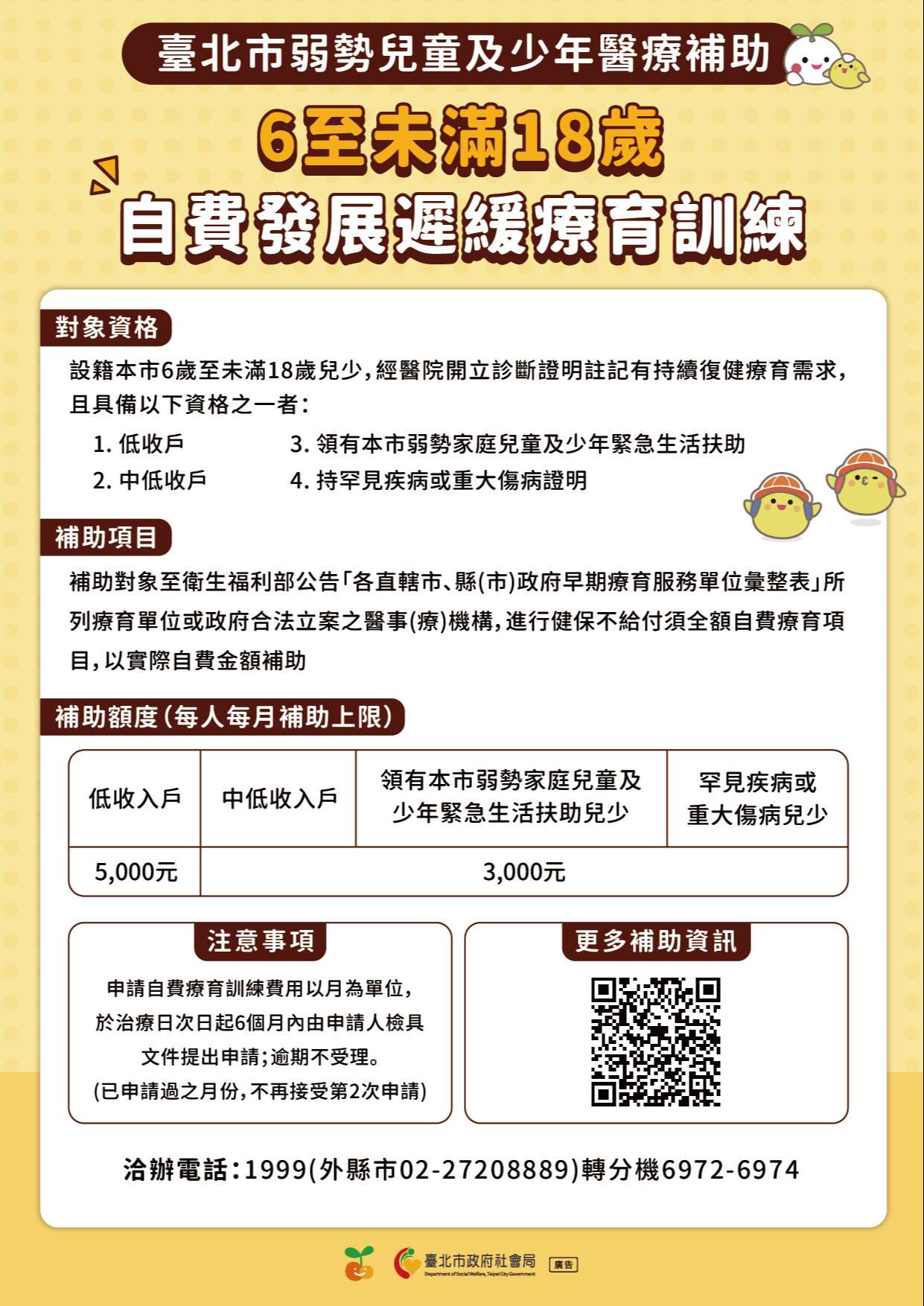 二、補助申請宣傳DM如附件,申請表件與說明資料請至社會局網站:首頁/兒童與少年服務/生活經濟扶(補)助/臺 北市弱勢兒童及少年醫療補助下載;如有疑問請致電02-27208889/1999轉6972-4。