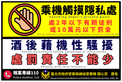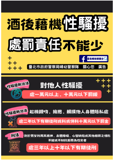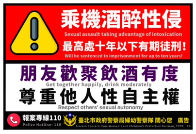 本市警察局為強化預防酒後藉機性騷擾(性侵害)犯罪行為發生,製作相關警示文宣,以提醒民眾尊重他人身體自主權,切勿觸犯法令。
