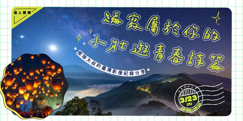 臺北市青少年發展暨家庭教育中心3月23日14:30舉辦壯遊達人開講「編寫屬於你的小壯遊青春詩篇—傑瑞大叔的臺灣影像紀錄分享」,傑瑞大叔與您分享壯遊的意義,以及過程中的挑戰,啟發大家思考壯遊方向。活動免費,詳見青發家教中心官網。