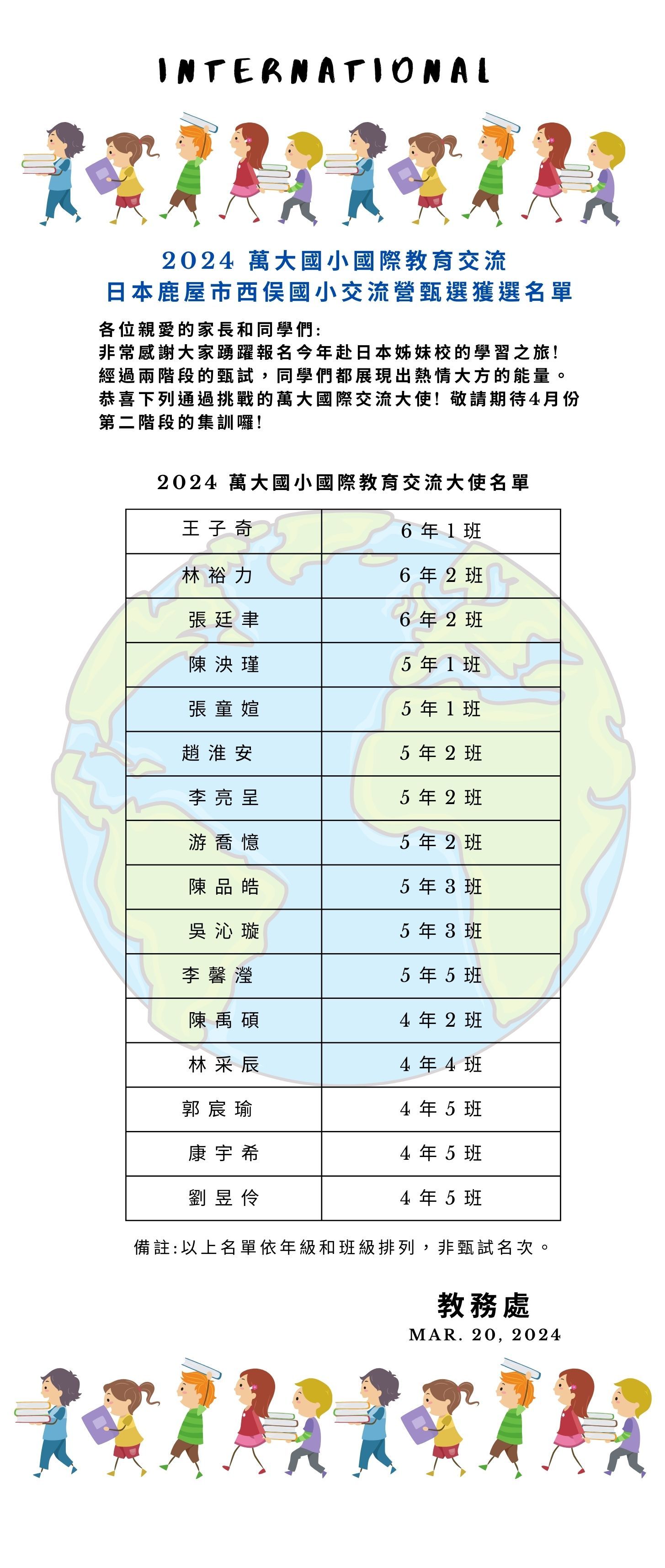2024 萬大國小國際教育交流大使獲選名單出爐! 恭喜獲選的同學! 感謝家長和老師的指導!