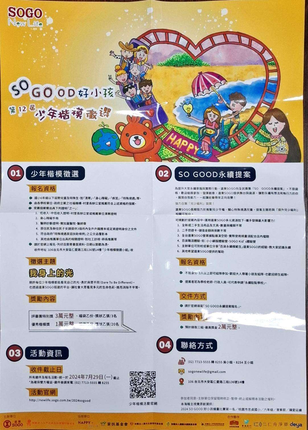 主旨:財團法人太平洋崇光社會福利基金會舉辦「第十二屆 SO GOOD 好小孩少年楷模」徵選系列活動,請詳閱附件之活動辦法說明。