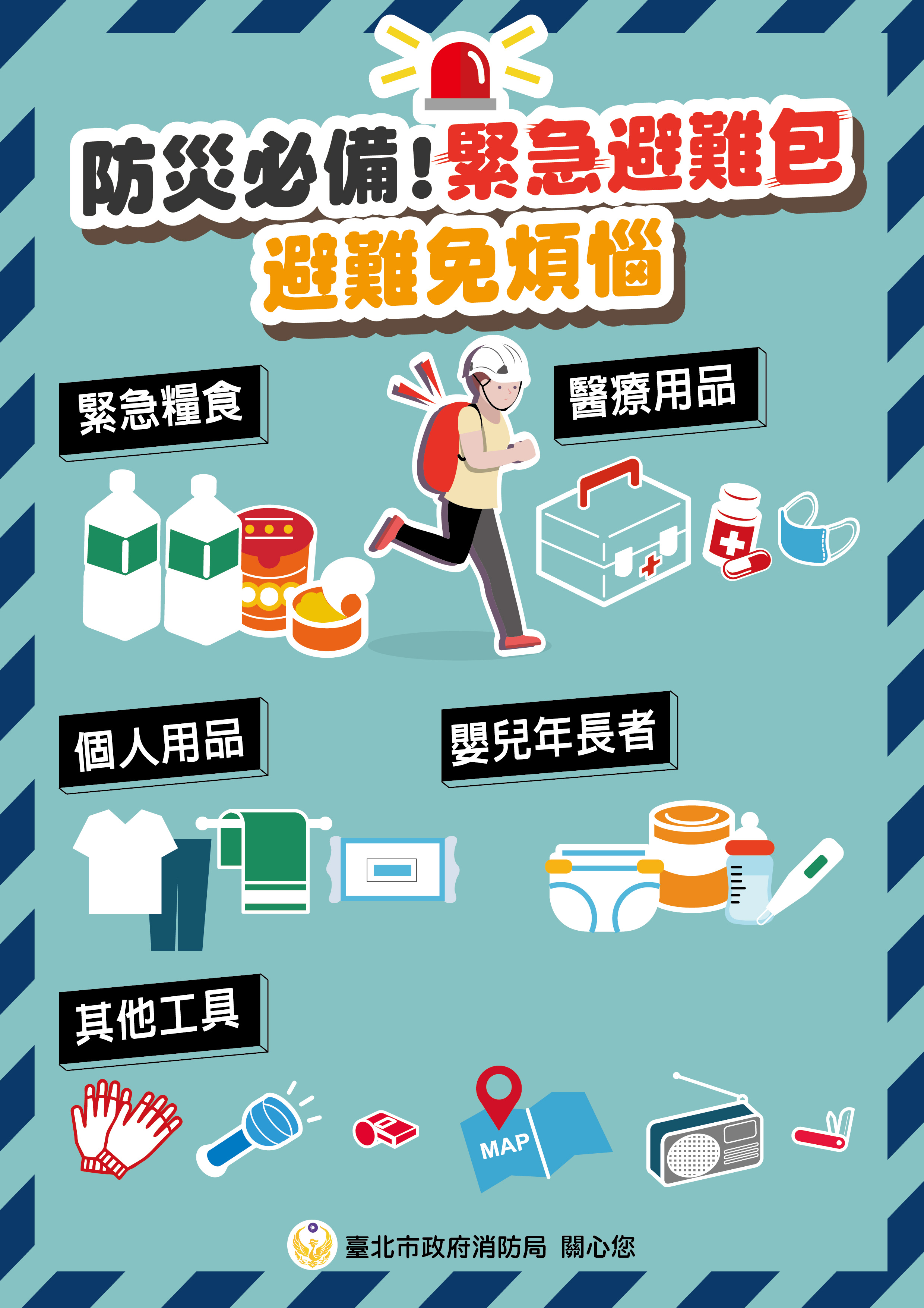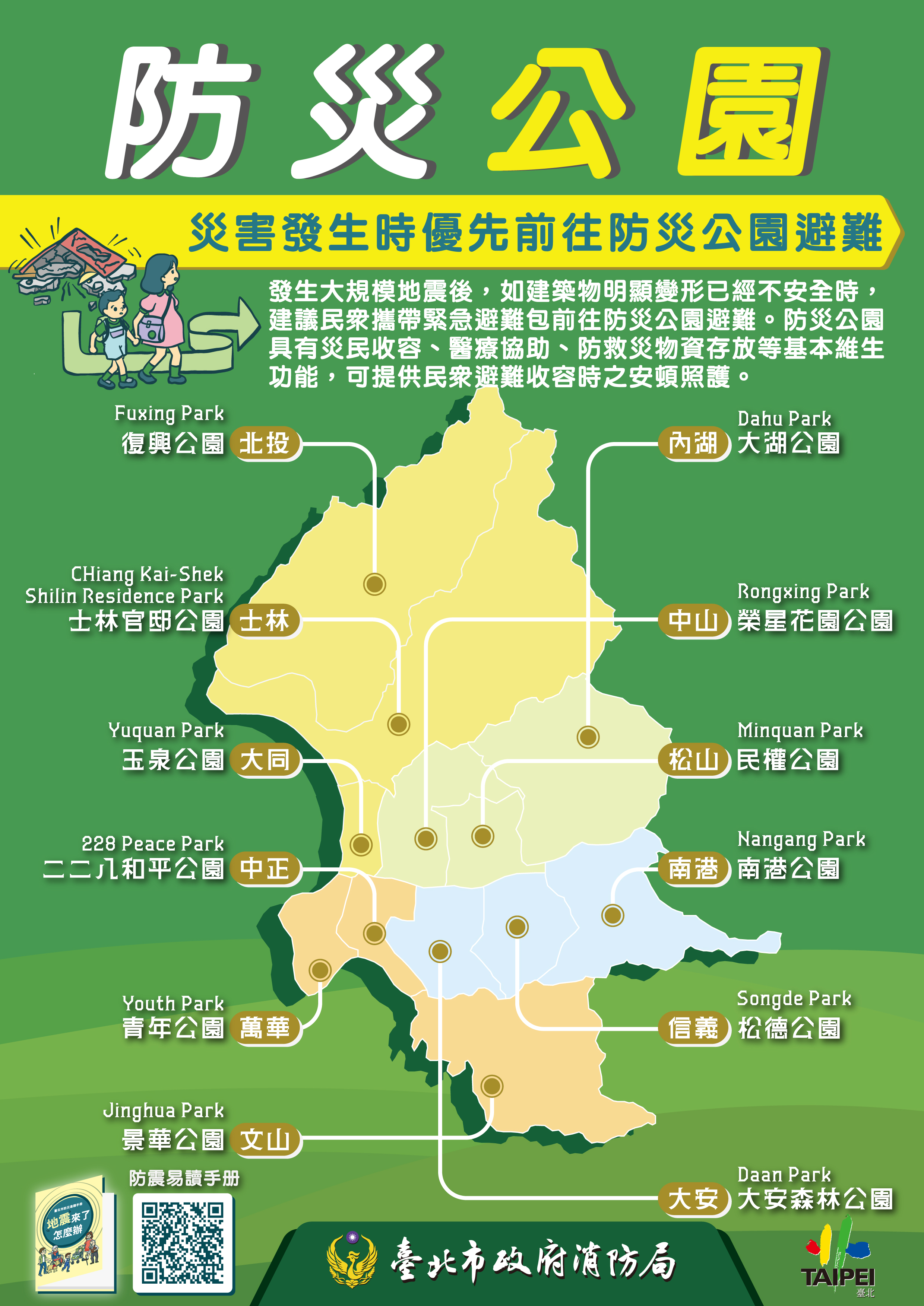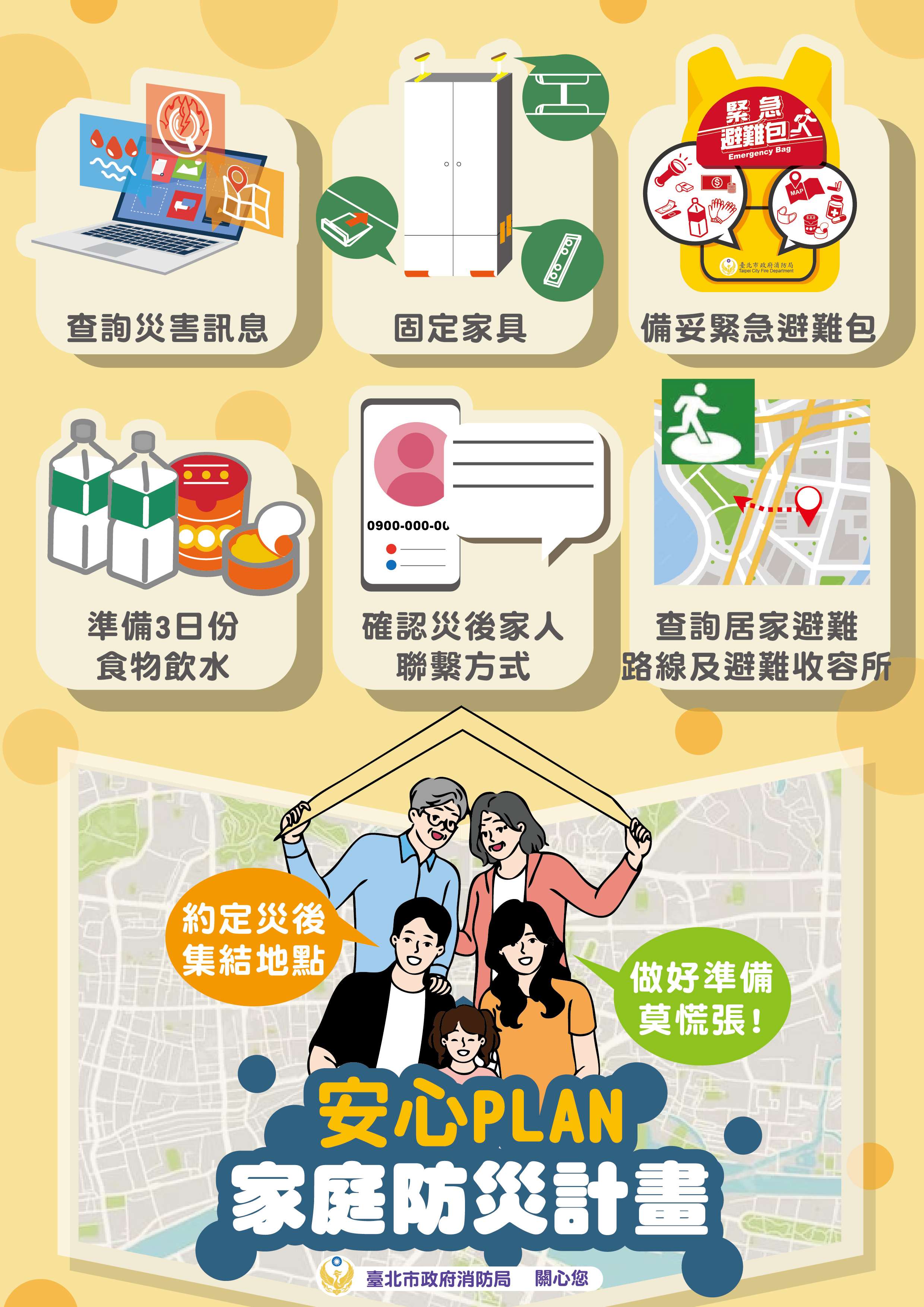 ★平時家具應固定,備妥日常儲備物資及緊急避難包。如遇地震,保持冷靜,立即採取「趴下、掩護、穩住」之動作,保護頭頸部,避免受傷。災後如建築物受損不宜居住,應前往最近的防災公園進行避難。
