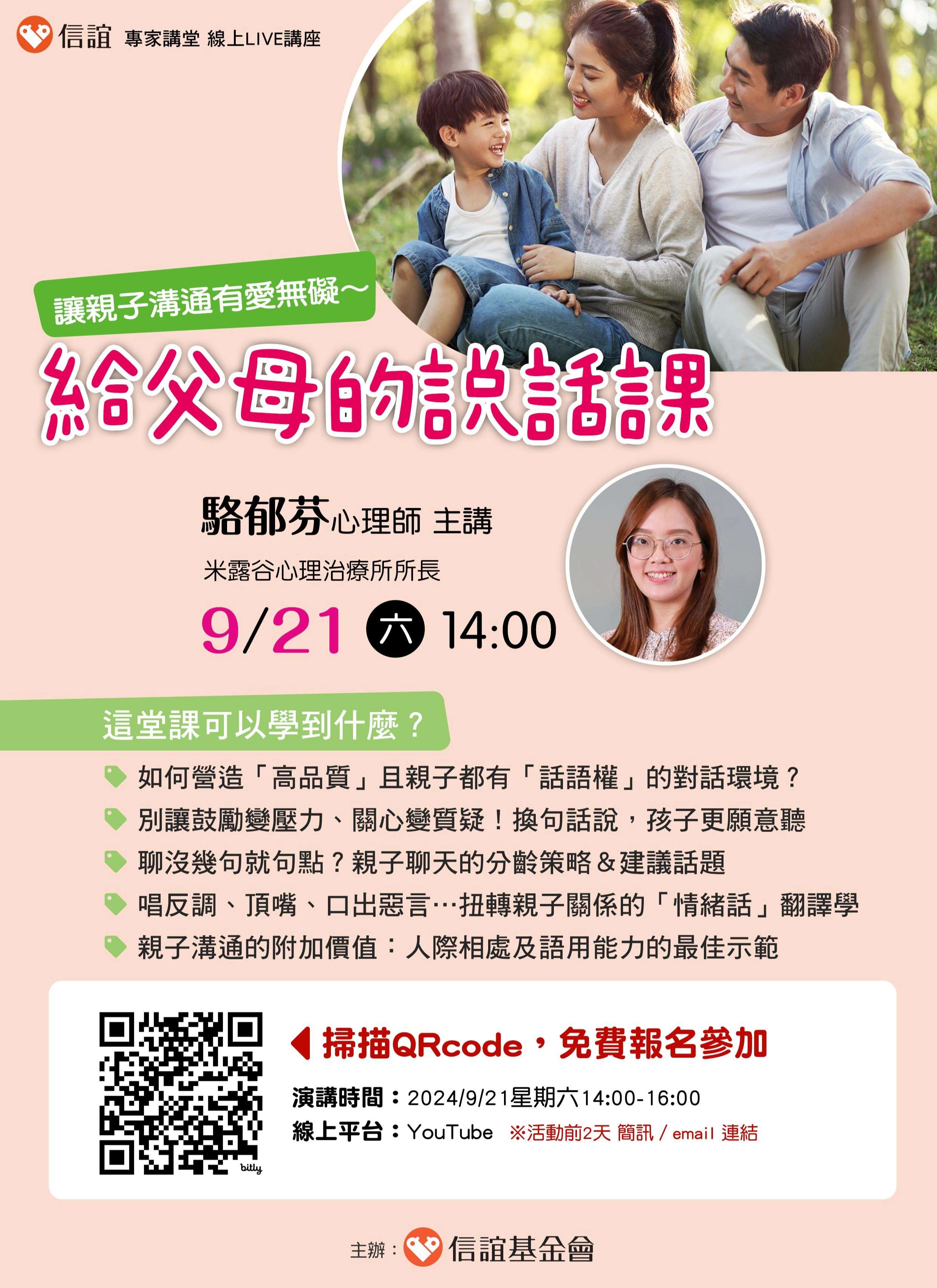 信誼基金會於9 / 21(六)舉辦【駱郁芬心理師主講/溝通有愛無礙~ 給父母的說話課】親職線上講座,免費報名參加。