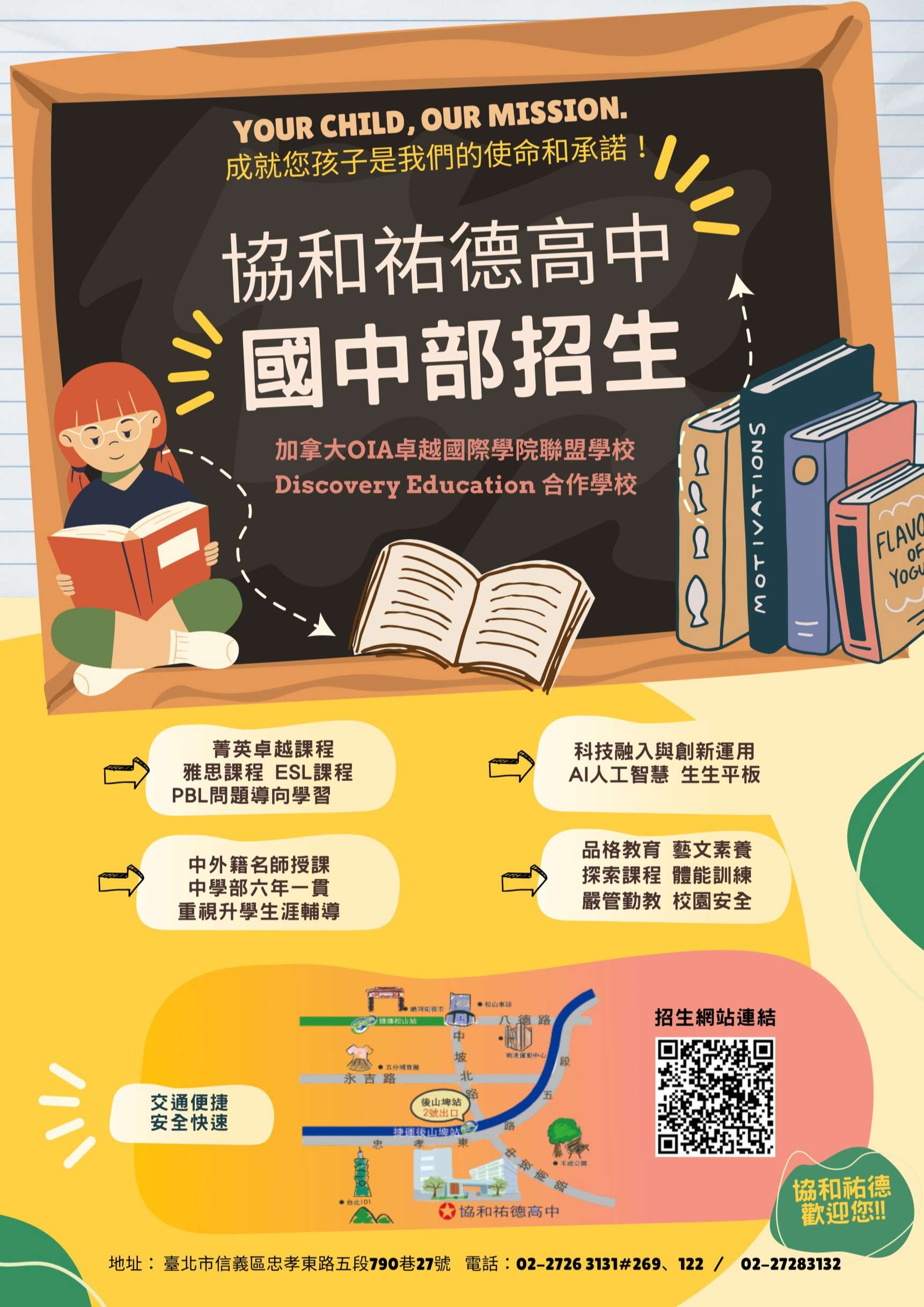 主旨:臺北市協和祐德高級中等學校將於114學年度招收國中部七年級學生兩班共80人,檢附招生海報鼓勵四、五、六年級學生家長參加各場次招生說明會。