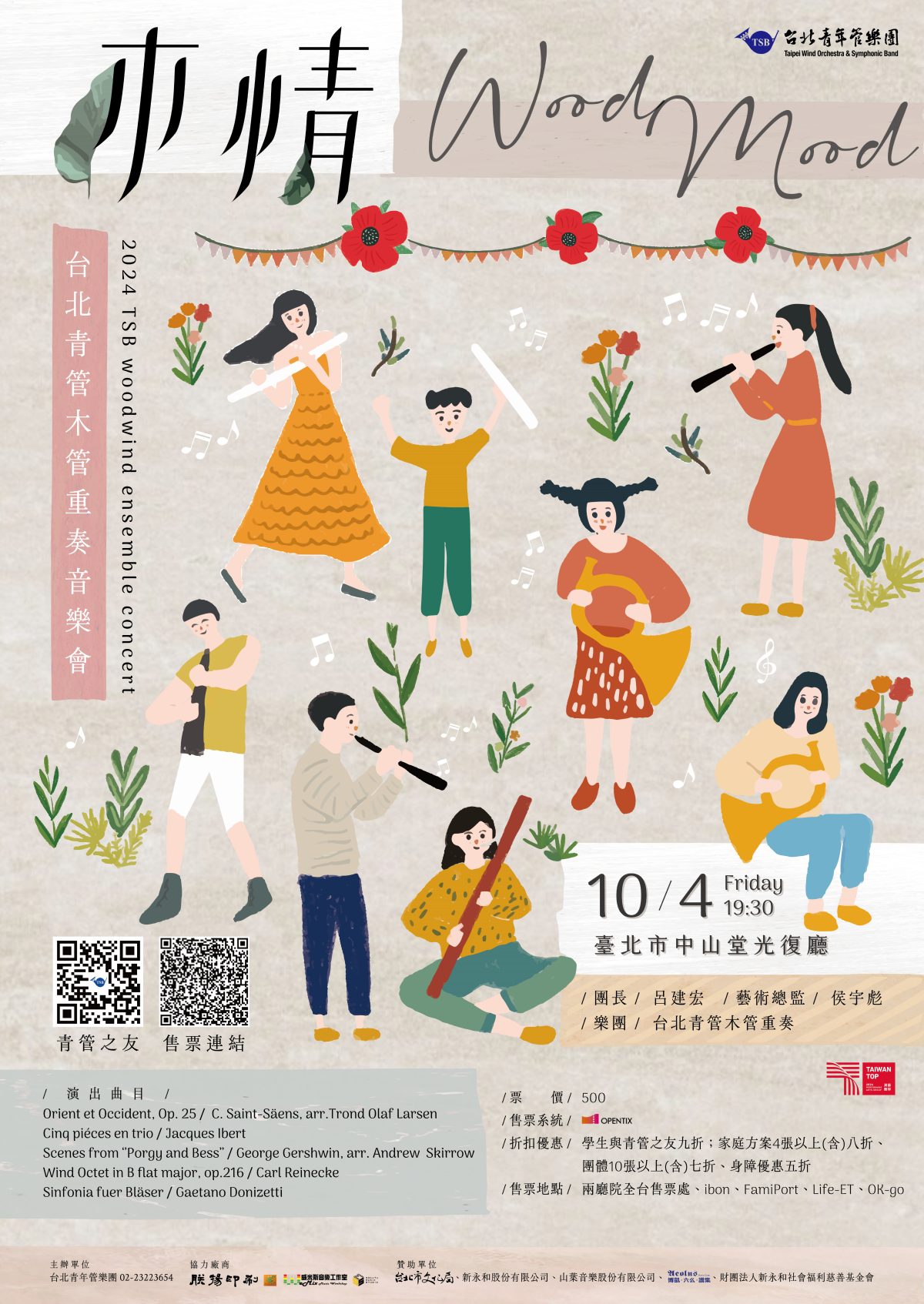 主旨:檢送「2024台北青管木管重奏音樂會《木情》」海報1份,敬請協助轉知轄屬學校、校內師生並鼓勵踴躍參與,至紉公誼,請查照。
