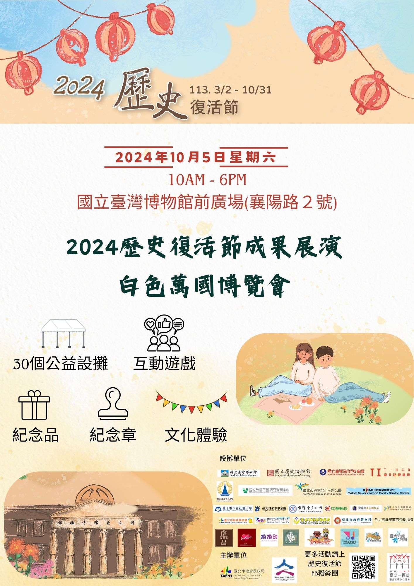臺北市中正區公所將在113年10月5日(星期六)上午10時至下午6時於二二八和平公園-國立臺灣博物館本館(襄陽路2號)前廣場,舉辦 「2024歷史復活節-白色萬國博覽會」,展演歷史復活節活動成果,特邀區內各機關、博物館、古蹟場館等一起設置30個公益攤位,邀請您一同品文化、玩體驗、拾回憶,感受獨特的中正區地方特色!更多活動詳情請上歷史復活節FB粉絲團(https://www.facebook.com/papagozhongzheng),或上臺北市中正區公所網站基層藝文專區(https://zzdo.gov.taipei/基層藝文)查詢。