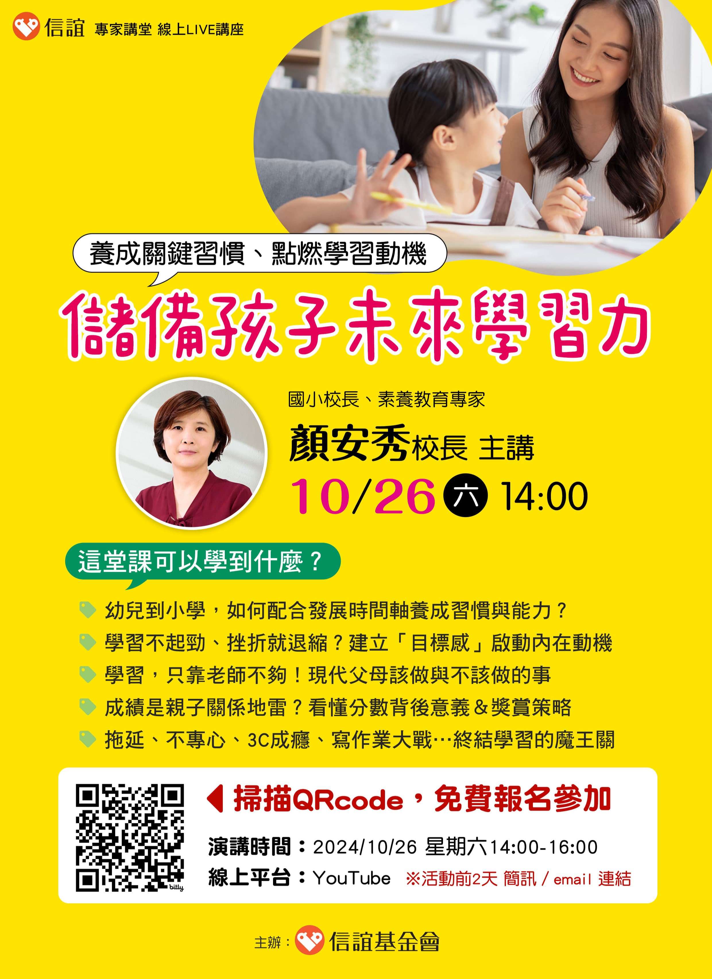 老師是不夠的!爸媽如何做才能幫助孩子儲備未來學習力呢?信誼將於2024年10月26日(六)下午2:00-4:00舉辦
