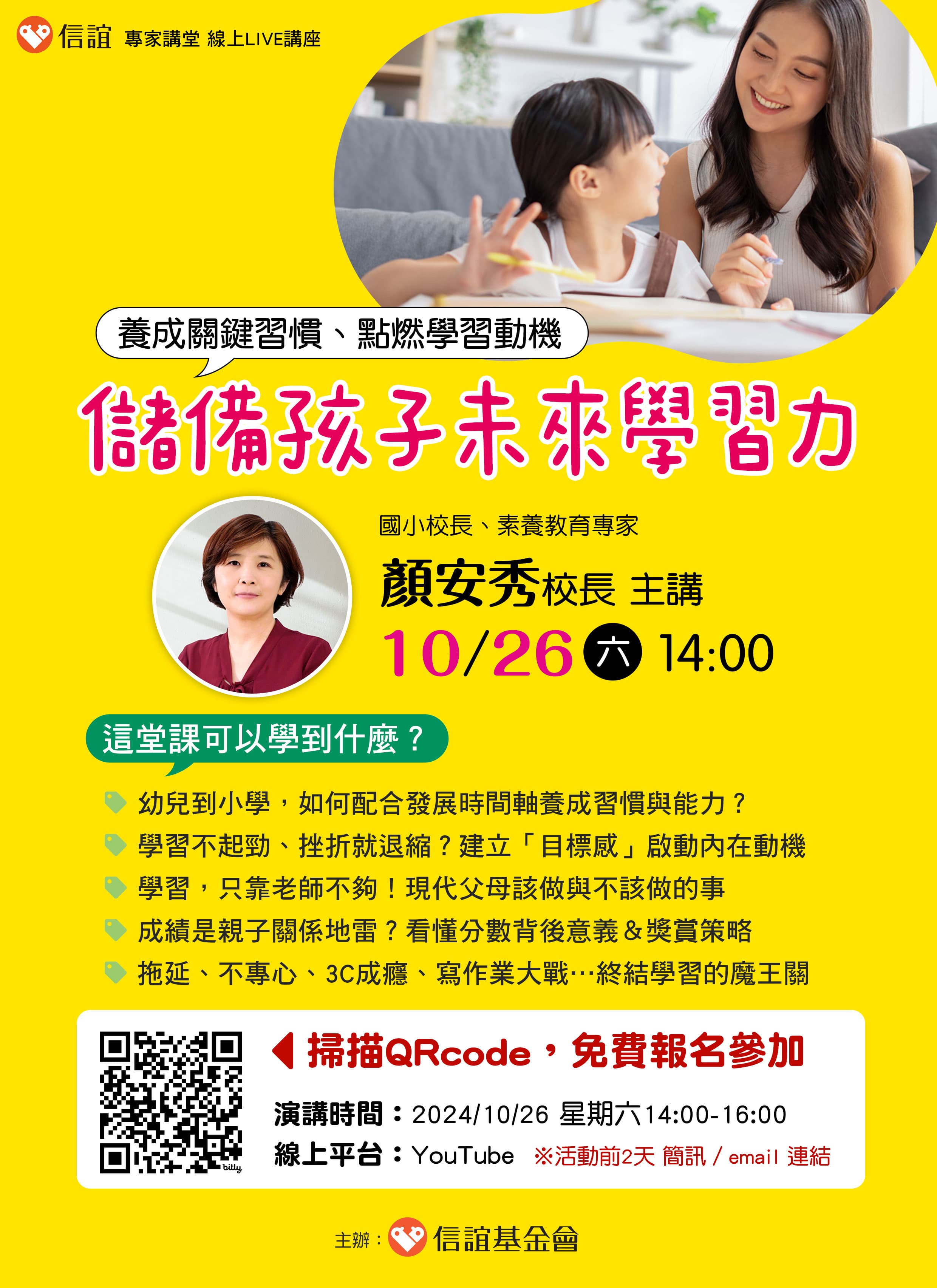 【養成關鍵習慣、點燃學習動機-儲備孩子未來學習力】線上LIVE講座,邀請爸媽免費報名參加。