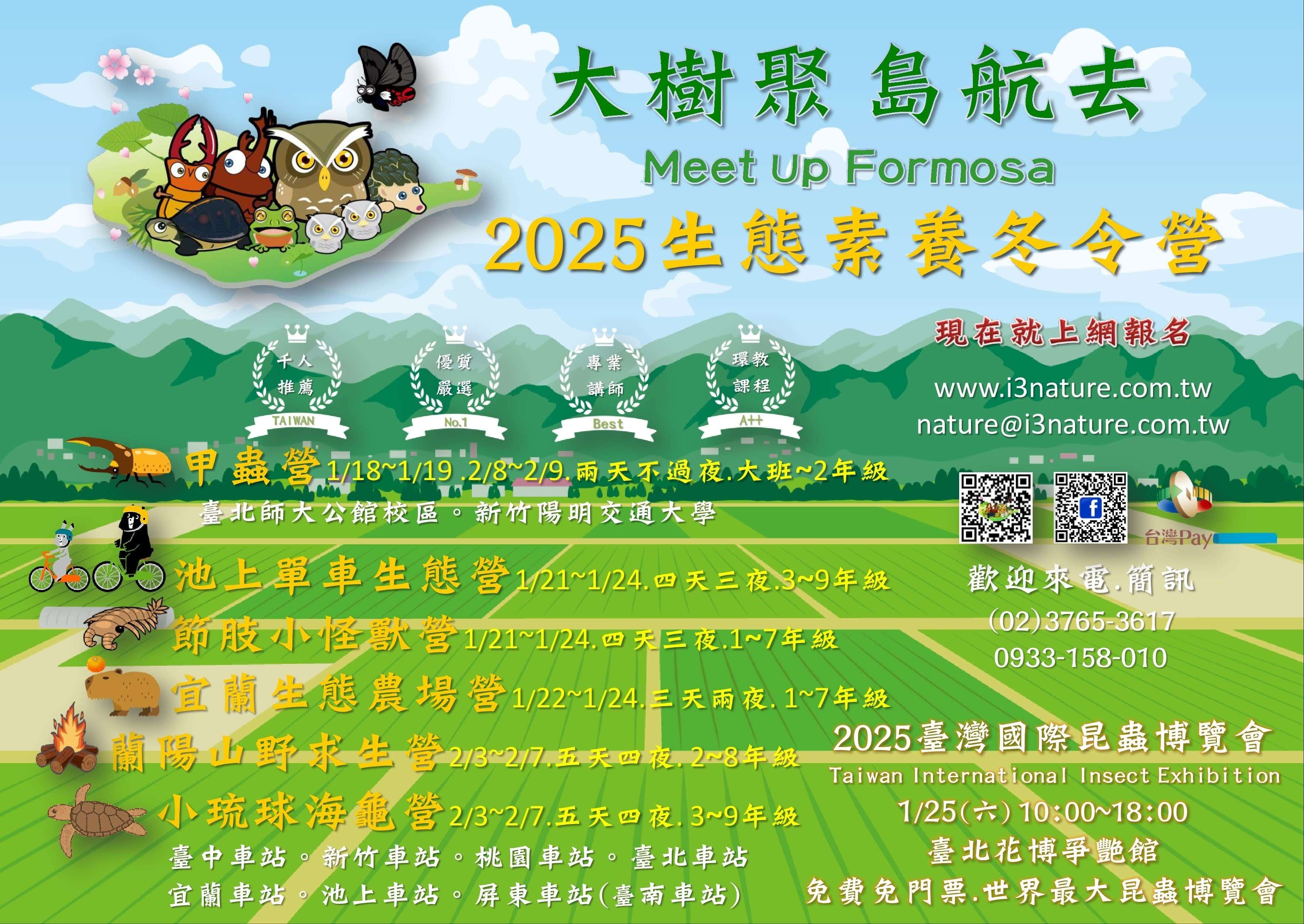 一、2025生態素養冬令營日期1/18~2/9,招生涵蓋大班-九年級學員,依不同課程分齡參加,詳細請見網站 www.i3nature.com.tw 。