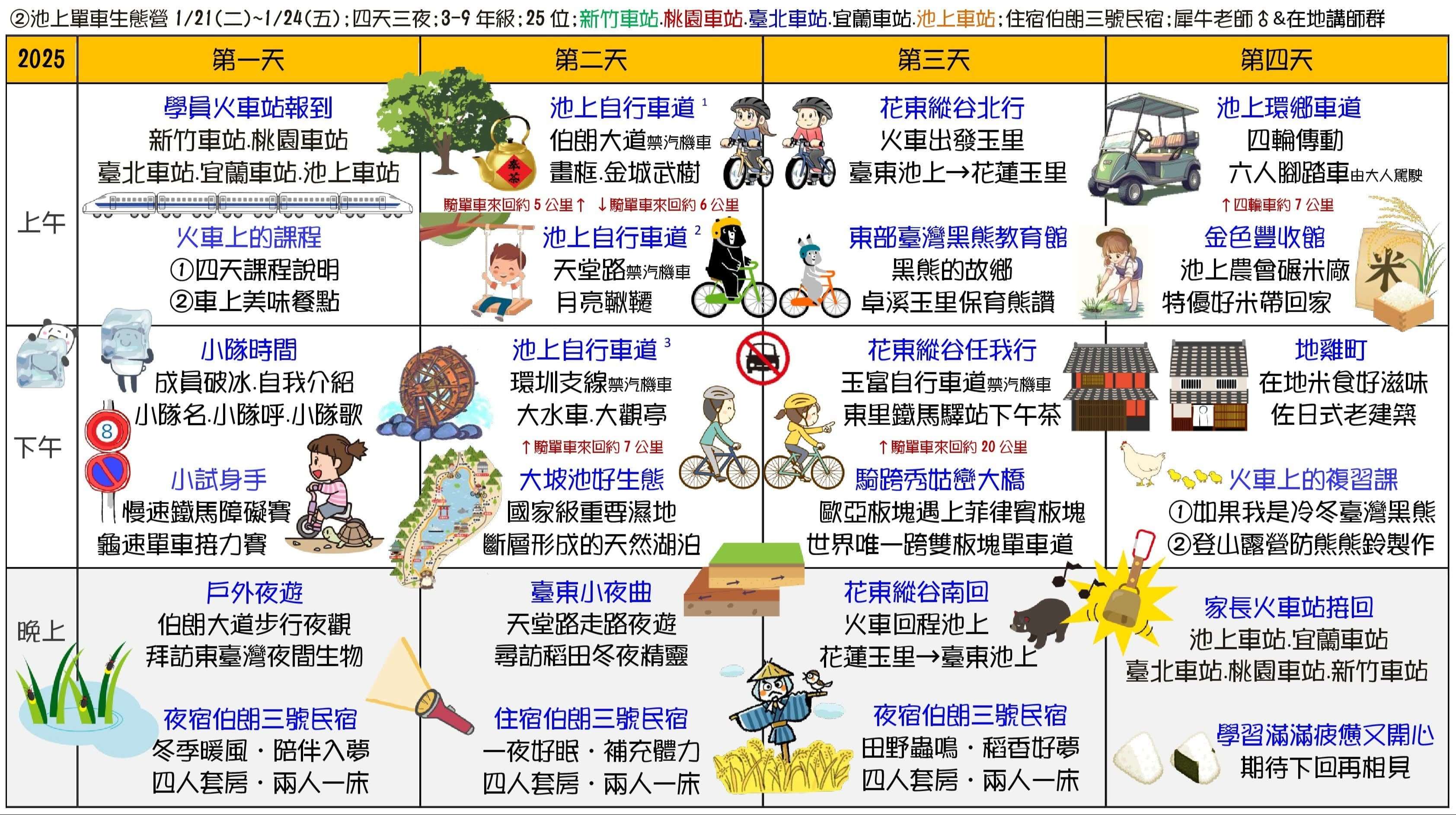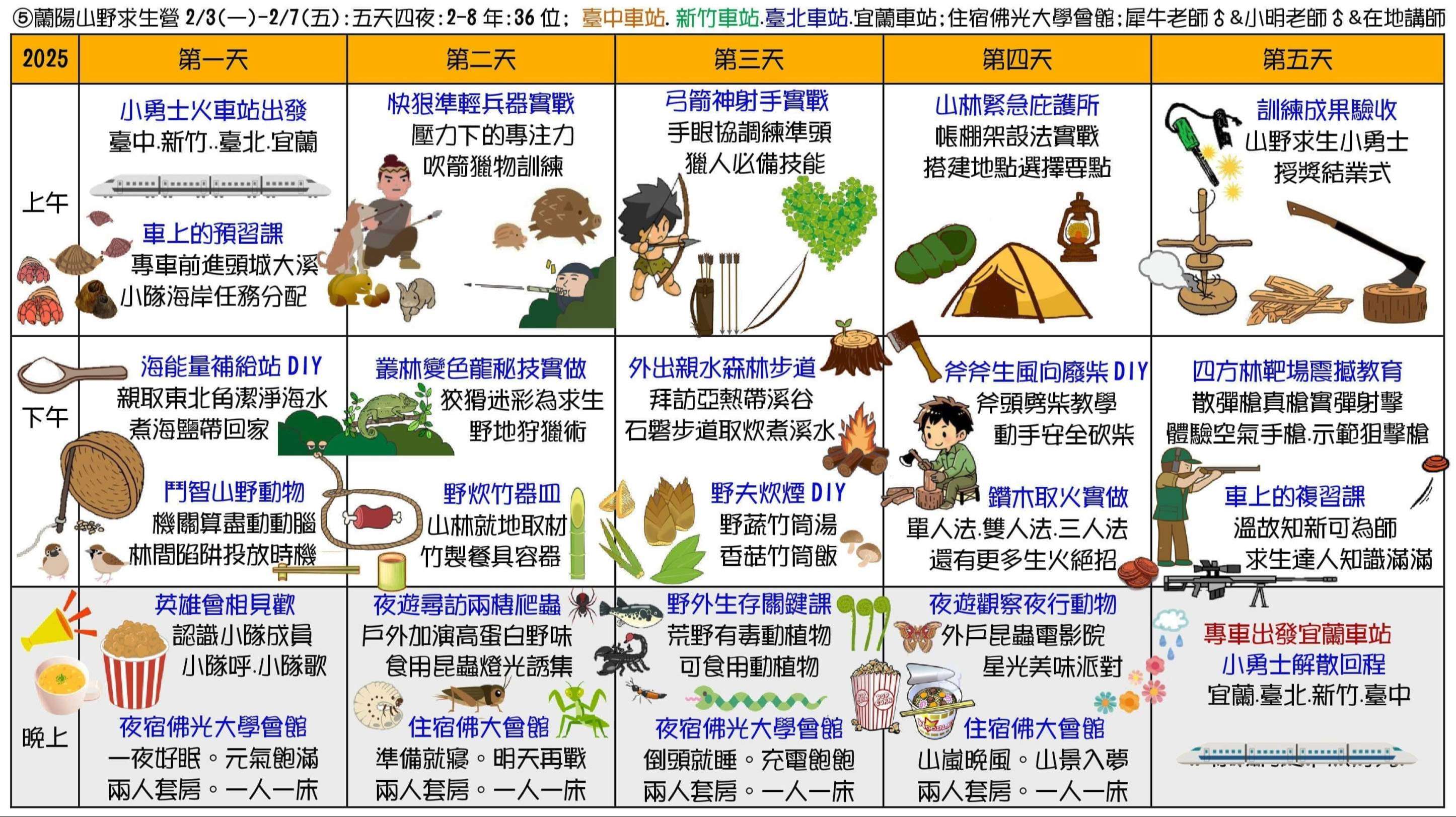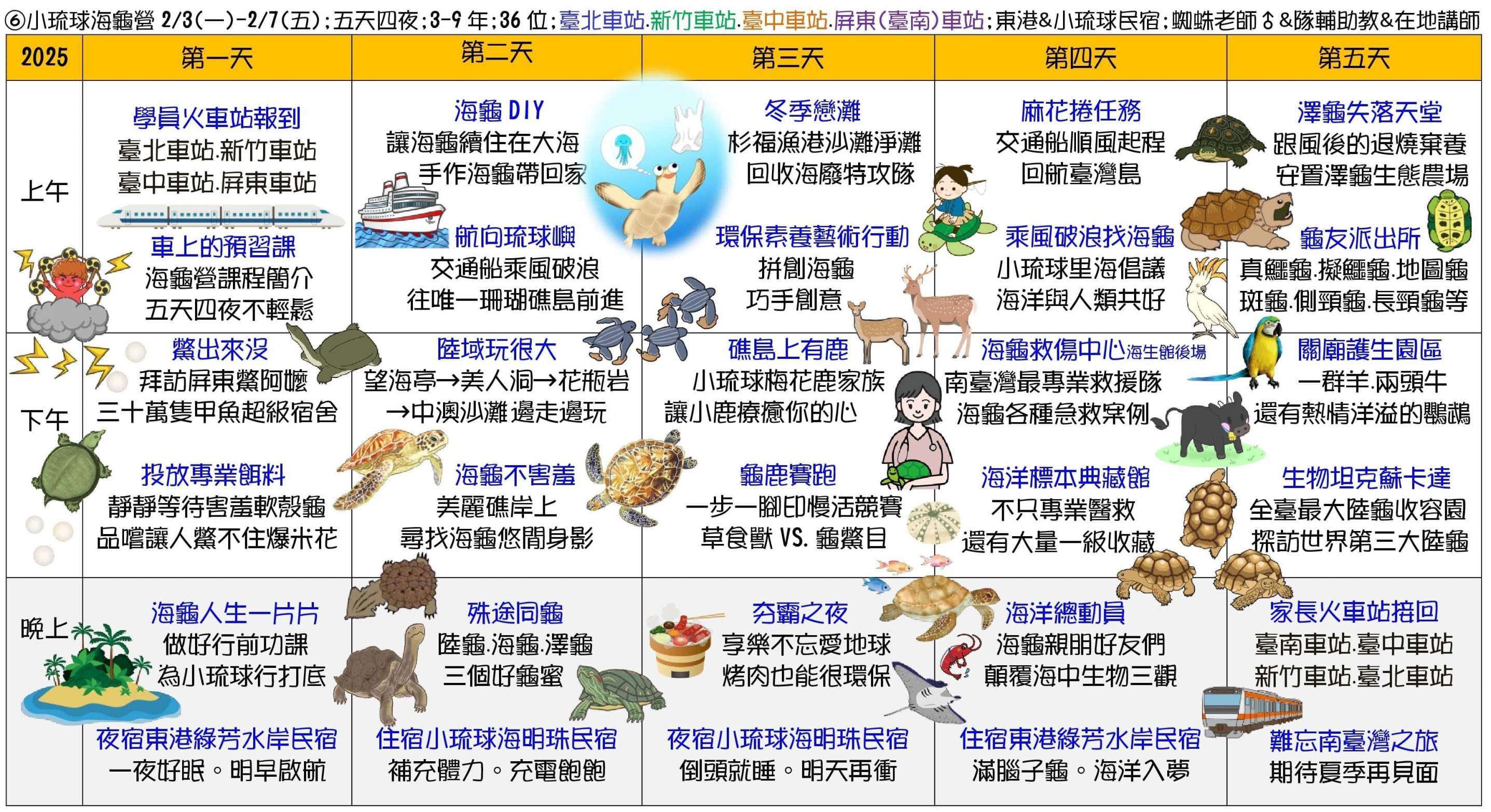 ①甲蟲營(2天)、②池上單車生態營(4天3夜)、③節肢小怪獸營(4天3夜)、④宜蘭生態農場營(3天2夜)、⑤蘭陽山野求生營(5天4夜)、⑥小琉球海龜營(5天4夜)。