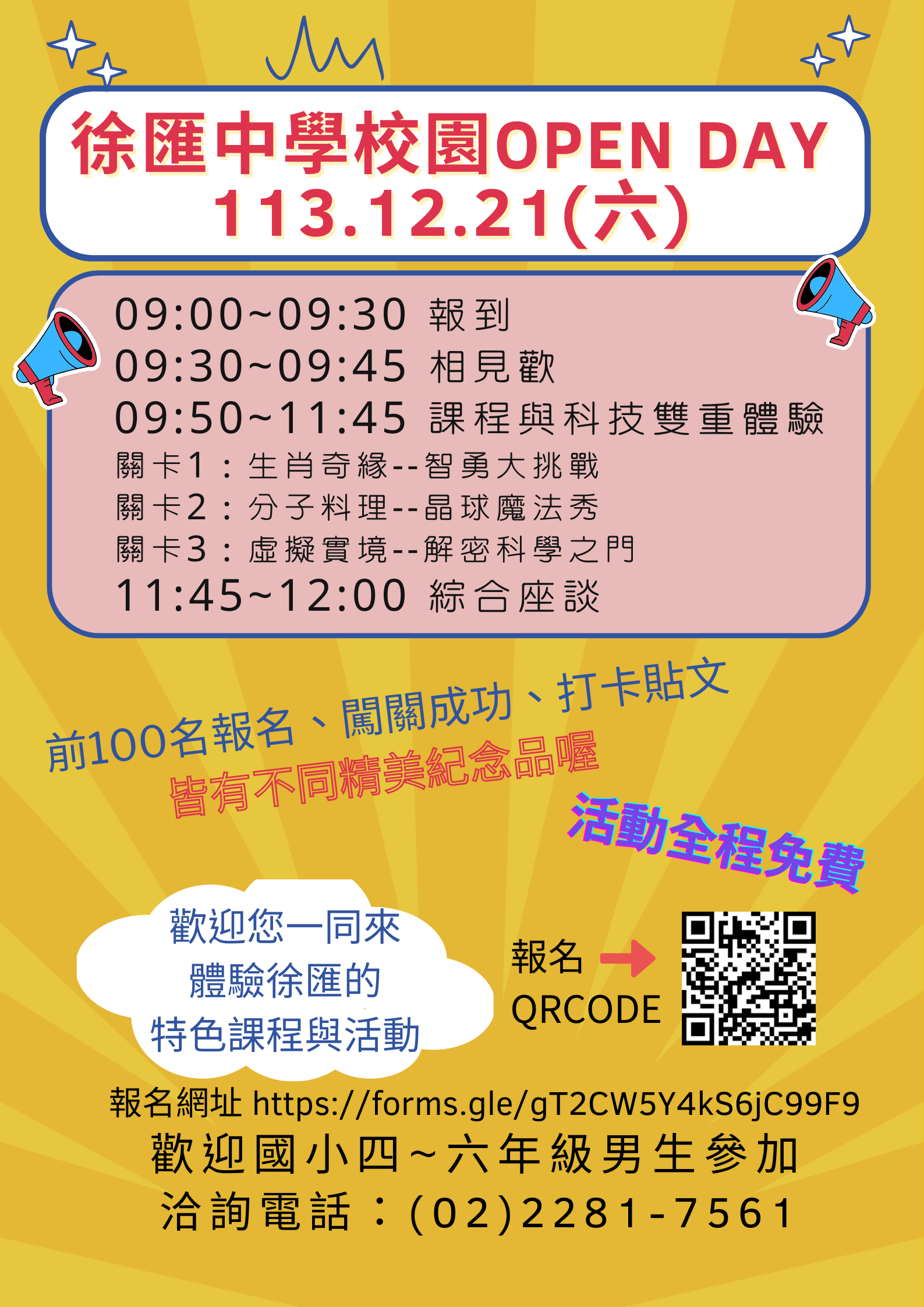 主旨:檢送本校於113.12.21(六)辦理「徐匯OPEN DAY」特色課程活動,敬請協助公告並鼓勵學生踴躍報名。