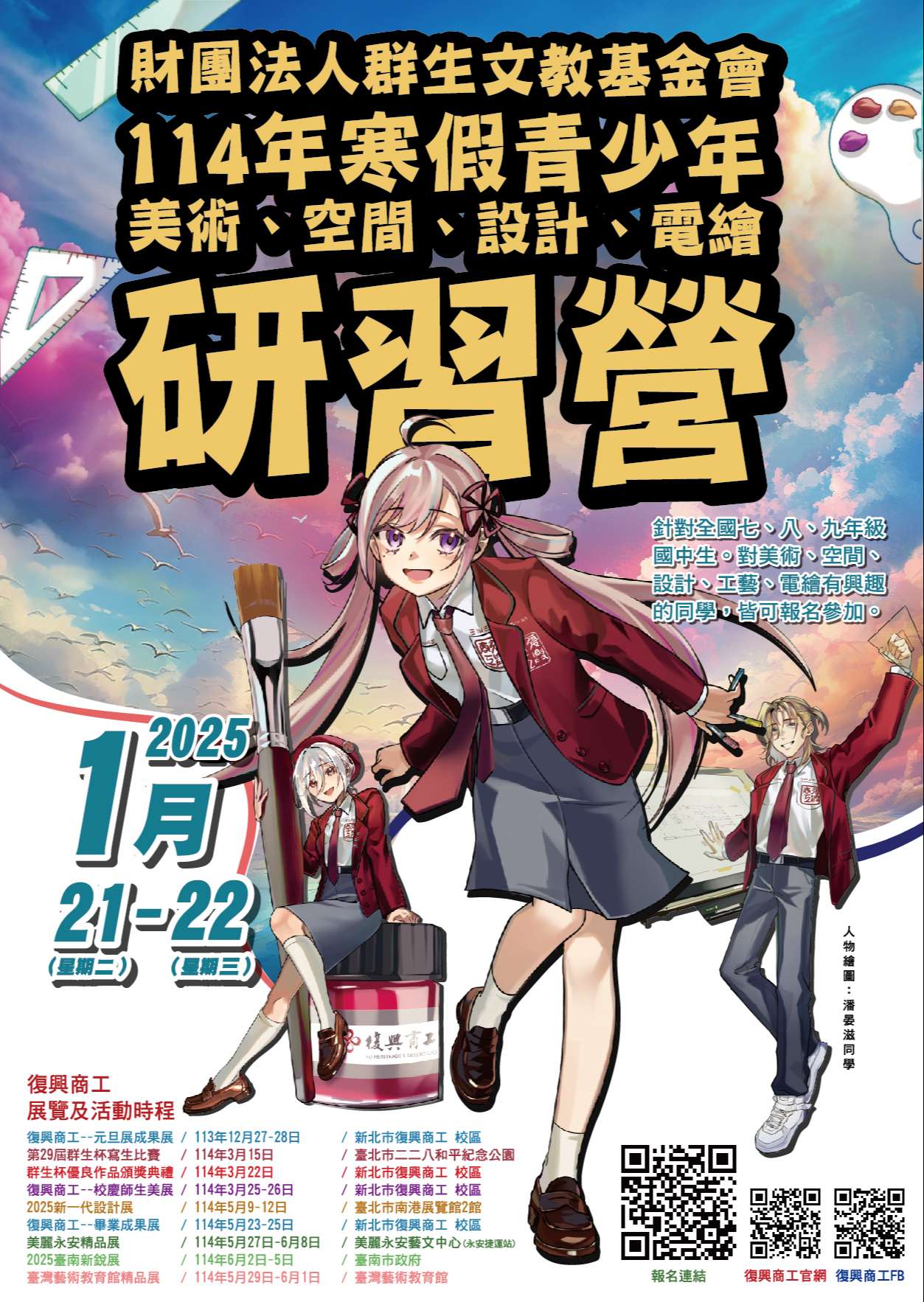 主旨:檢送本校承辦財團法人群生文教基金會「114年寒假青少年美術、空間、設計、電繪研習營」活動簡章,敬請 惠予宣導,鼓勵學生踴躍參加,請查照。