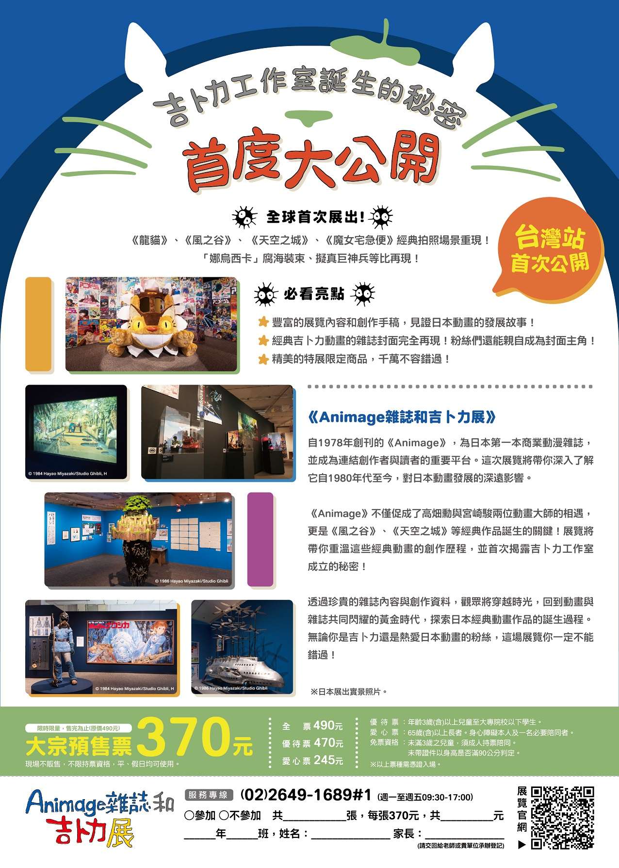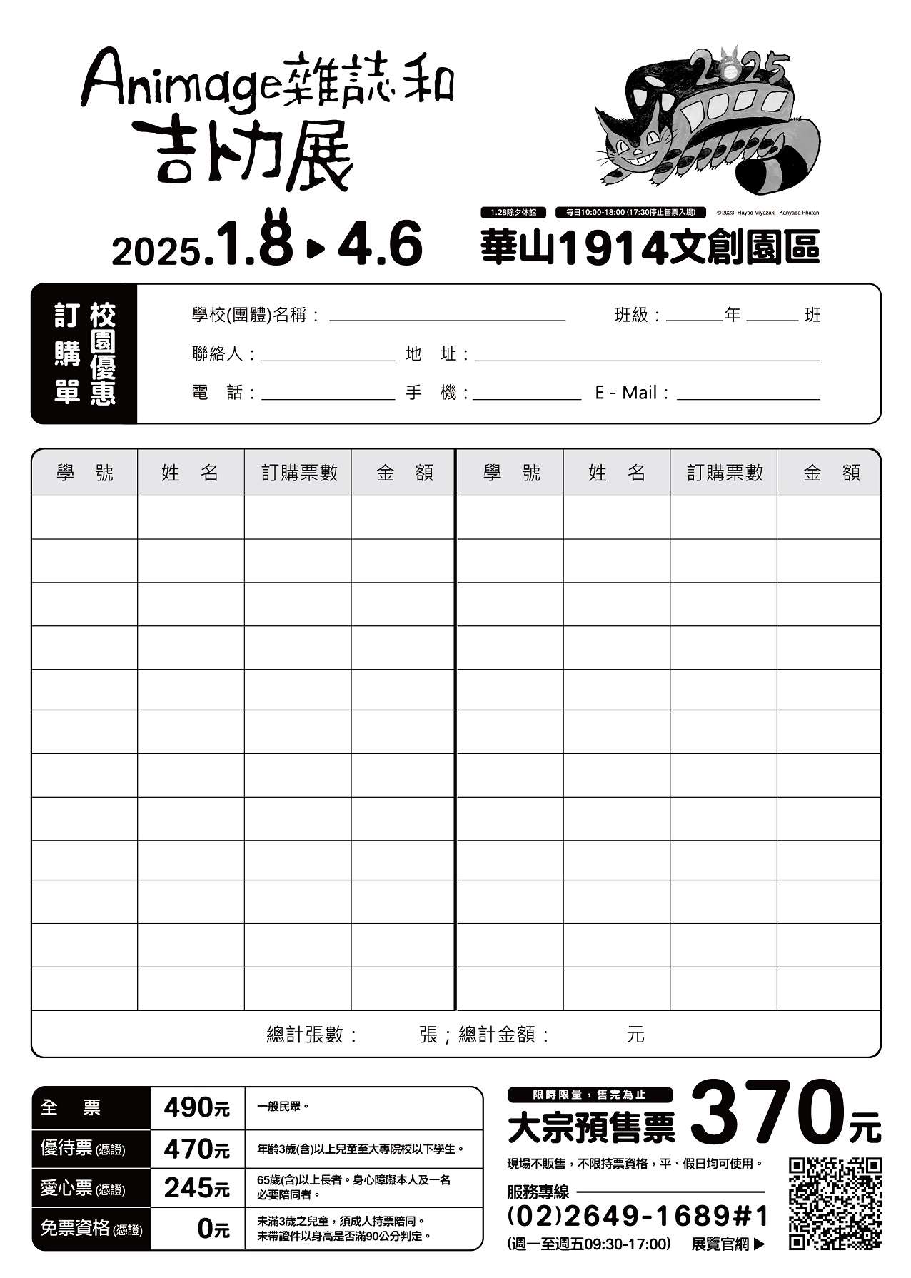 主旨:本公司訂於114年1月8日~114年4月6日於華山1914文創園區東2C、D棟舉辦「Animage雜誌和吉卜力展」,敬請協助公告周知,鼓勵師生及家長踴躍參與,並規劃進行校外教學及其團體參觀之參考依據,請查照。