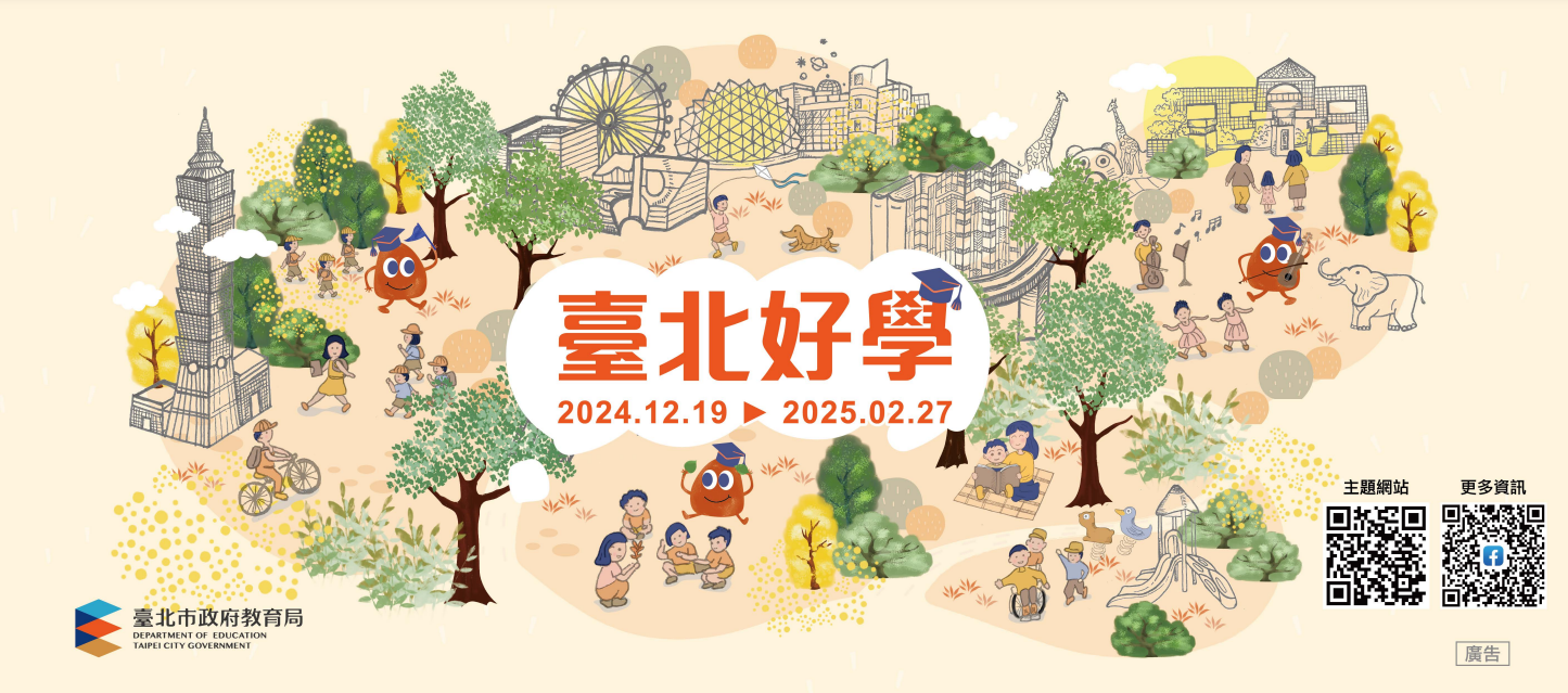 教育局規劃「臺北好學」活動,為推廣本市教育成果,活動 內容以邀請民眾走進平日鮮少開放的教育場域「臺北好好 學」體驗活動及以臺北10大好學為核心的「臺北城市走讀 GO!」兩大主軸推動,其中「臺北城市走讀GO!」規劃於114 年1月2日至2月27日在臺北捷運(忠孝復興站)北側藝文 廊,以特展圖文並茂方式呈現臺北教育亮點,同時為推廣 閱讀教育、自主學習及響應淨零碳排目標,結合本市圖書 館與捷運站相關據點,邀請民眾搭乘捷運參與。