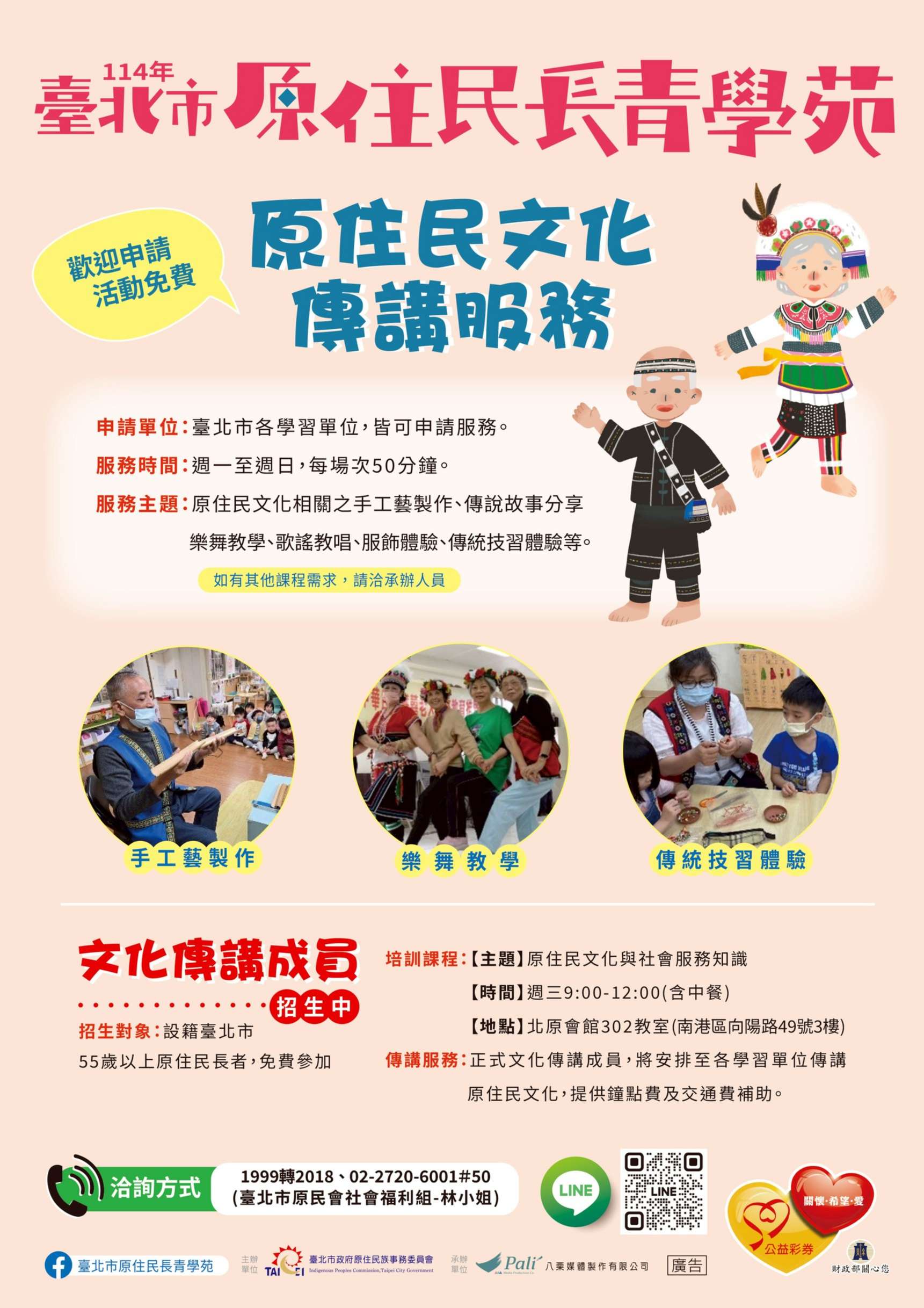 主旨:轉知台北市政府原住民事務委員會辦理「114年臺北市原住民長青學苑—樂活服務方案」,協助轉知並踴躍報名申請。