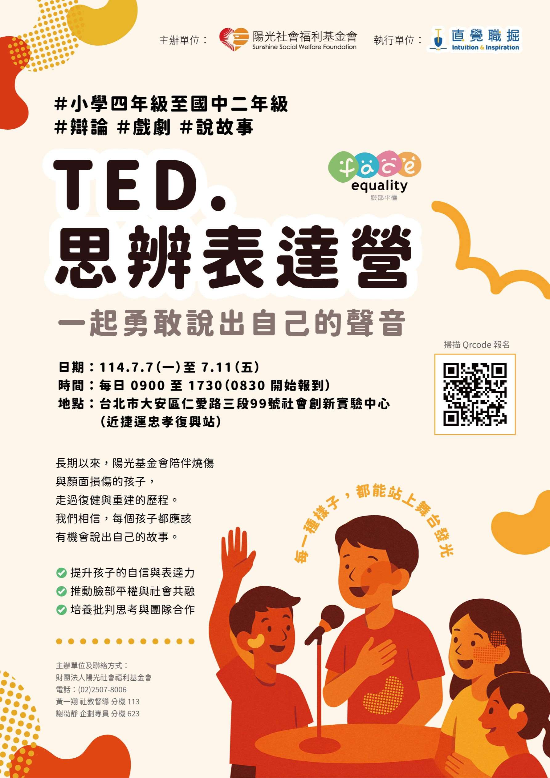一、陽光基金會成立於民國七十年,以服務顏損及燒傷者為主要對 象,多年來針對顏損及燒傷者傷病後之需要提供生理重 建、心理諮商、社會適應、就業服務、與經濟服務等全方 位之關懷,於2011年開始到校進行宣導、社區活動擺攤宣 導,辦理臉部平權日活動,已逐步喚起社會大眾對「臉部 平權」議題之關注與認識,一同打造友善社會。 二、為使兒少能更關注日常生活中與自己、與他人相關的事 物,不僅更願意表達,且能自在說出自己的想法,建立其 自信、表達力與同理心,本會攜手「直覺職掘」將於7月份 共同辦理「盛夏OPEN MIND 表達OPEN MIC---TED.思辨表達營」,以思辨訓練結合戲劇教育,透過小組討論、辯論演 練、街訪實作與舞台發表,引導兒少勇敢發聲、理解多 元,並從中認識容貌焦慮與外貌歧視等議題。
