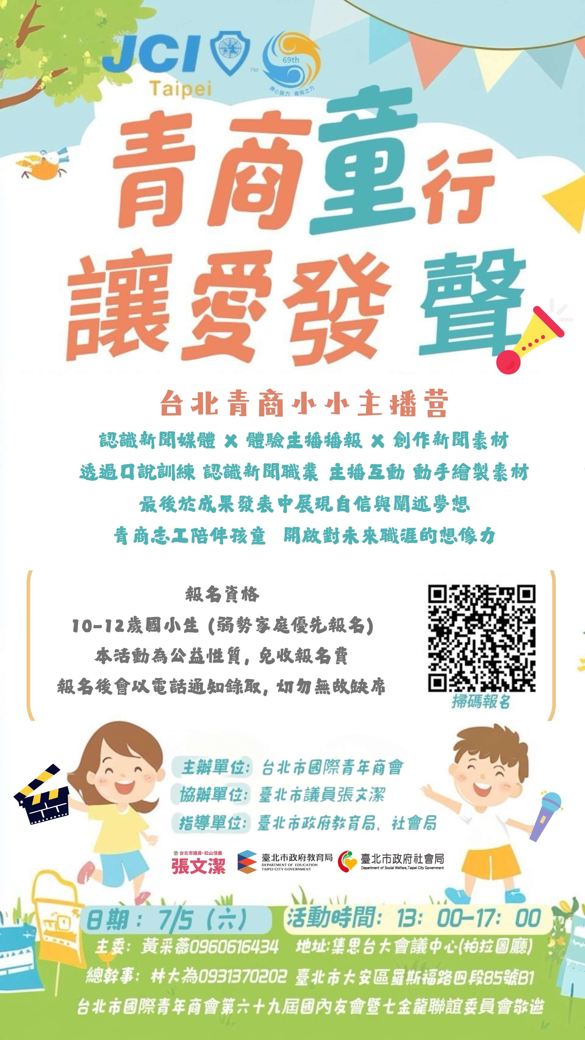 主旨:轉知 台北市國際青年商會辦理之「青商『童』行‧讓 『愛』發生」活動資訊,協助公告並鼓勵學生參加。