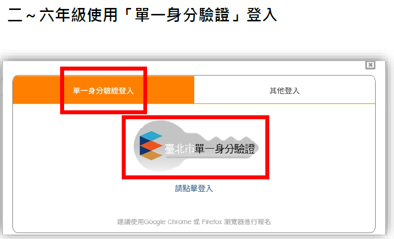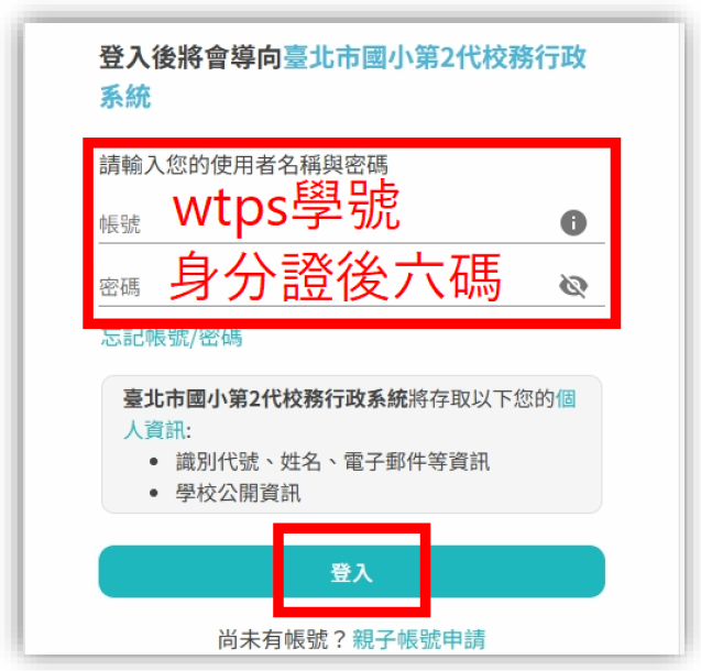 二~六年級學生的單一身分驗證登入帳號為「wtps學號」(例如: wtps110068),密碼為「身分證末六碼」(預設)。