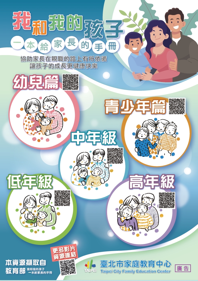二、為陪伴家長與孩子共同經營學校及家庭生活,教育部邀集專家學者編製《我和我的孩子-一本給家長的手冊》親職教育手冊(包含幼兒篇、國小低、中、高年級及青少年 篇),針對家有學前、國小及青少年階段孩子的家長,可能面對的親職課題,透過簡單易懂的條列式小提醒,協助家長輕鬆學習親職知能及技巧。