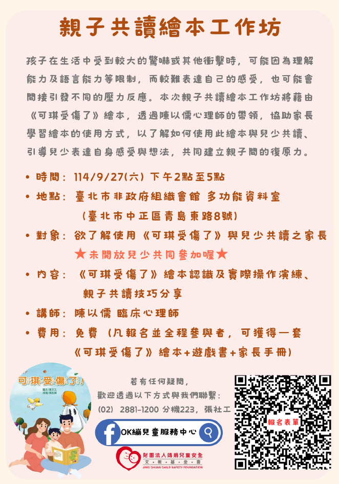 主旨:轉知OK繃兒童服務中心辦理114年度「親子共讀繪本工作 坊」。