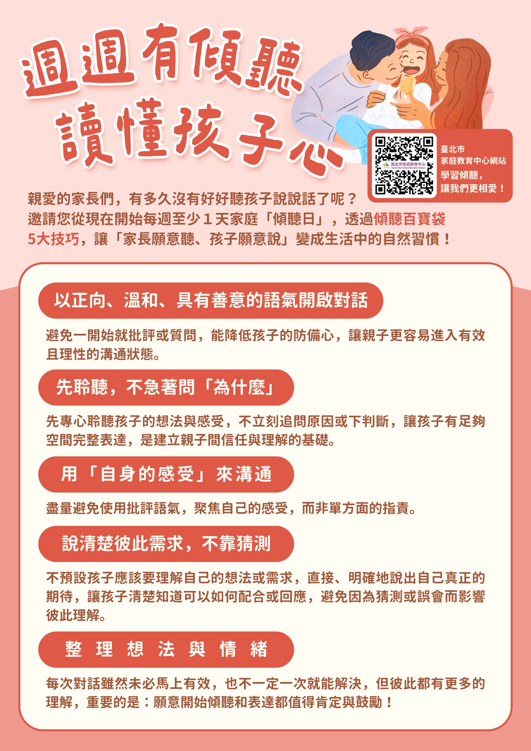 一、為打造「家長願意聽,孩子願意說」的環境,鼓勵所有家長每週至少撥出一天為家庭「傾聽日」,暫時放下手邊的忙碌,專心聽孩子內心的聲音,透過「傾聽百寶袋」5大技巧,協助家長有效實踐傾聽,促進親子間雙向溝通與情感交流。