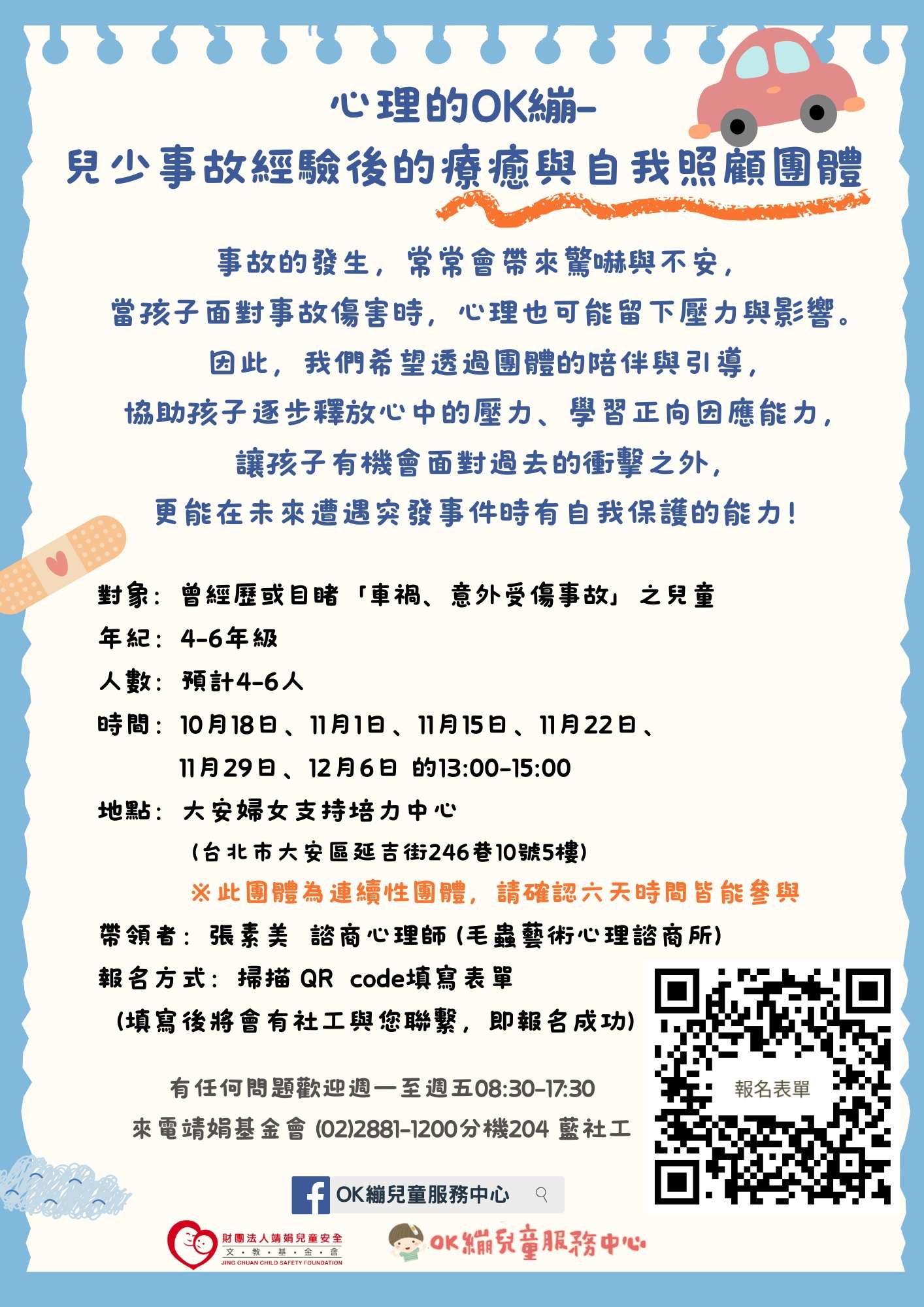 三、檢附「心理的OK繃—兒少事故經驗後的療癒與自我照顧團體」宣傳單1份。
