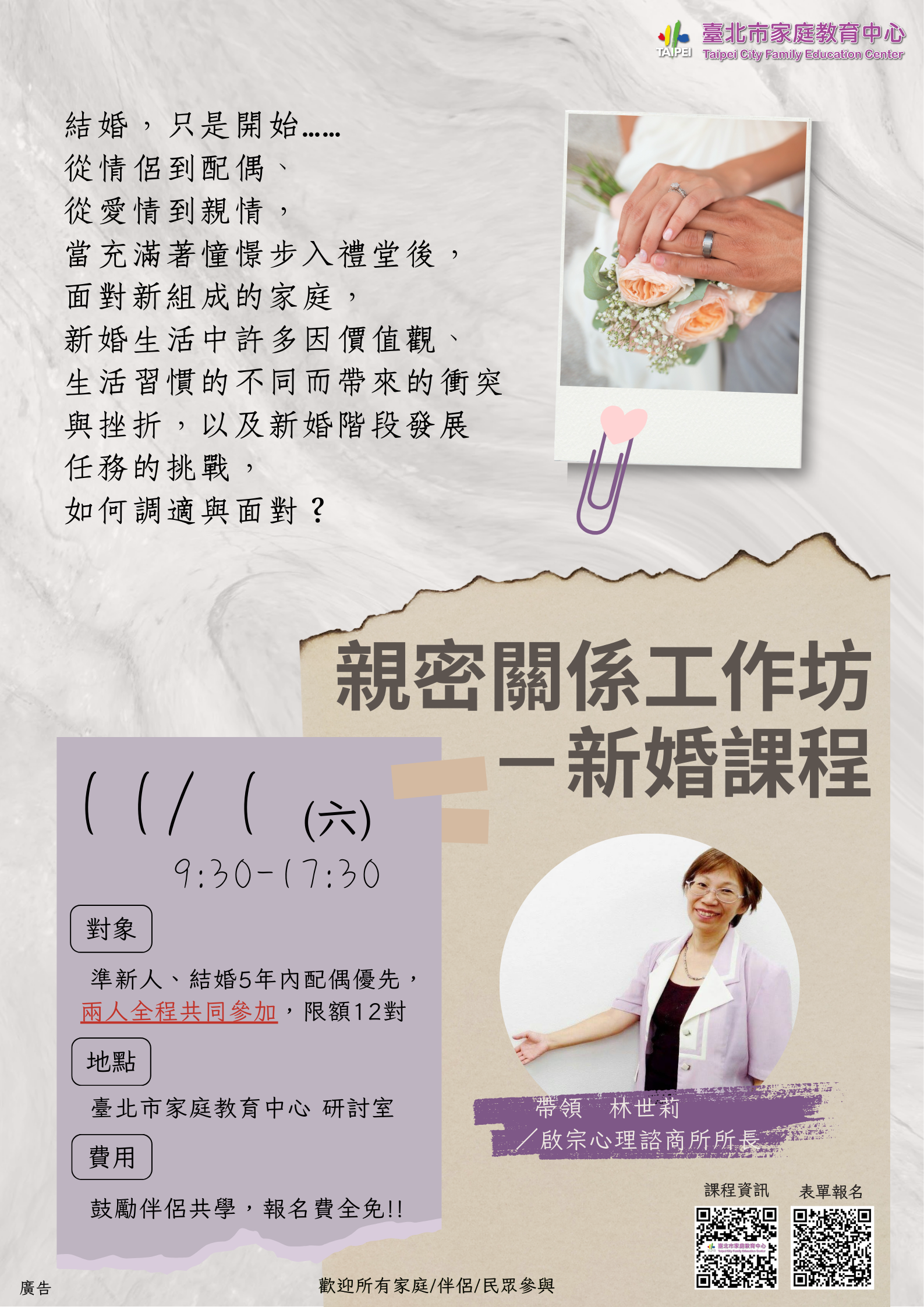 三、歡迎參加臺北市家庭教育中心11月1日舉辦之「親密關係工作坊-新婚課程」,幫助家庭新鮮人迎接婚姻生活挑戰,學習欣賞包容,順利並持續經營關係!報名請官網查詢。