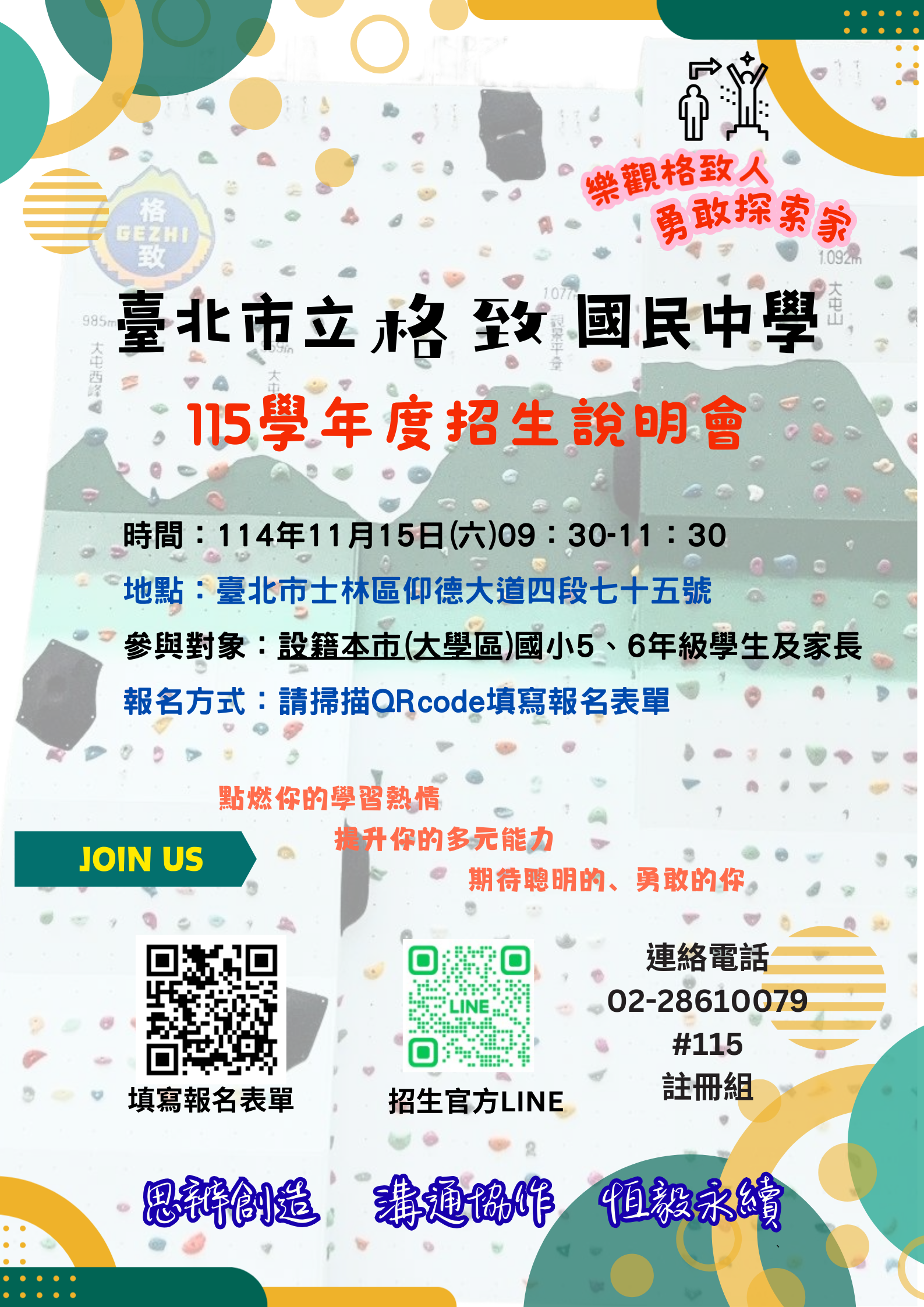 主旨:轉知 格致中學115學年度招生說明會相關資訊,鼓勵學生及家長踴躍參與。