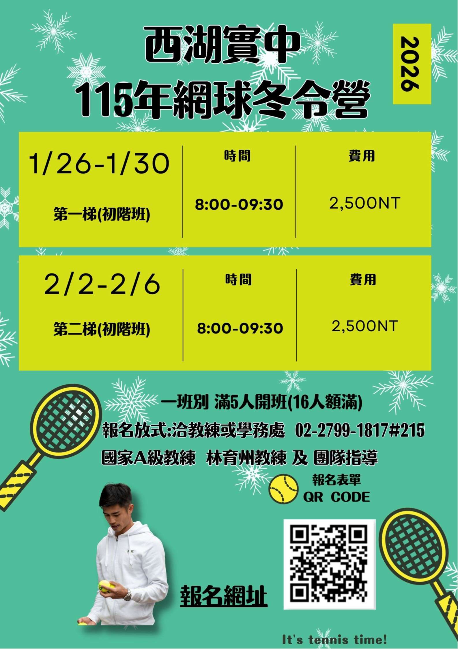 1、初階班(第一梯次),無網球經驗,學習基本動作:115 年1月26日(一)至1月30日(五),上午8:00-09:30, 共計5天。