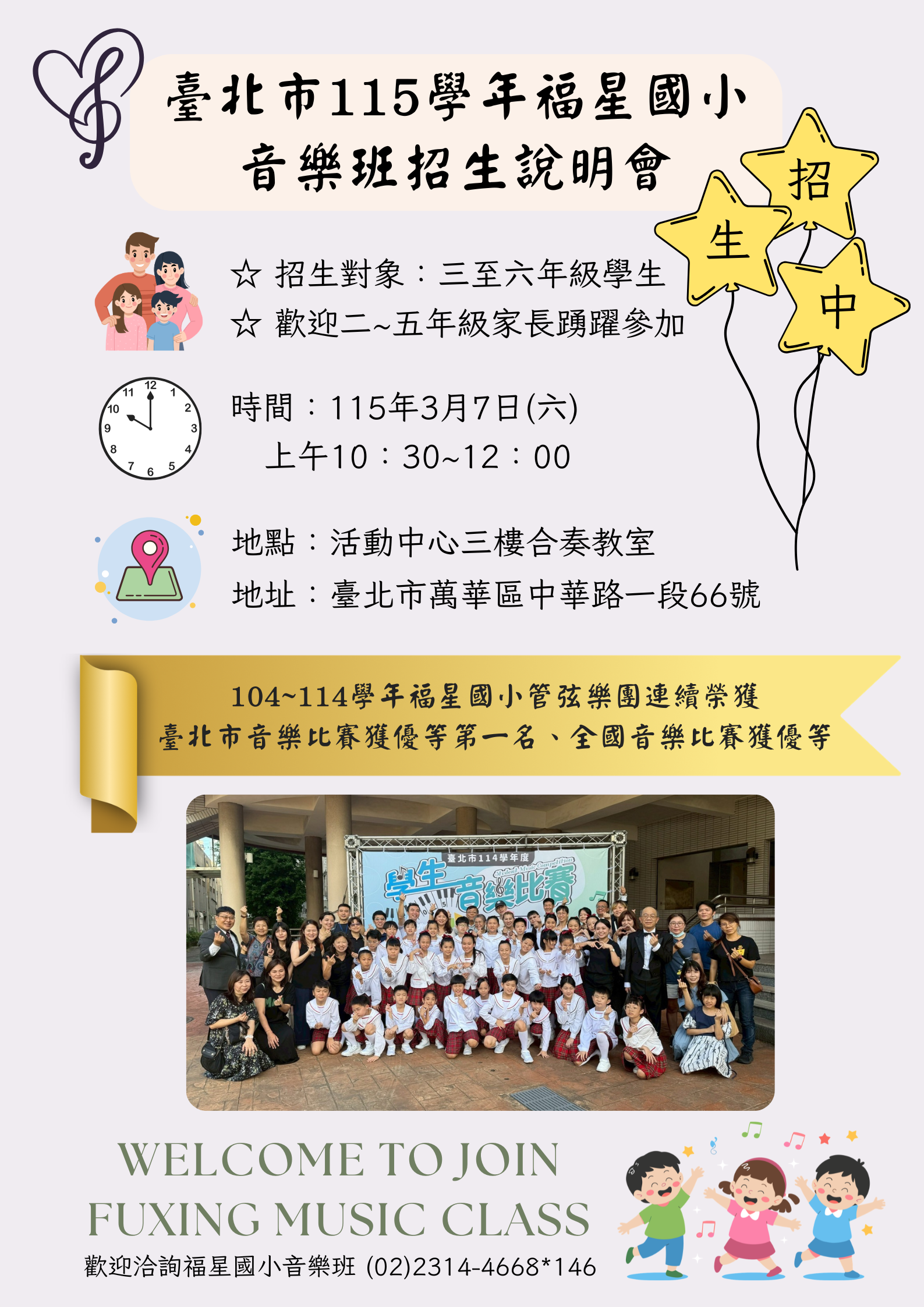 地點:福星國小學生活動中心三樓合奏教室。(臺北市萬華區中華路一段66號,捷運北門1號出口站或西門町6號出口)