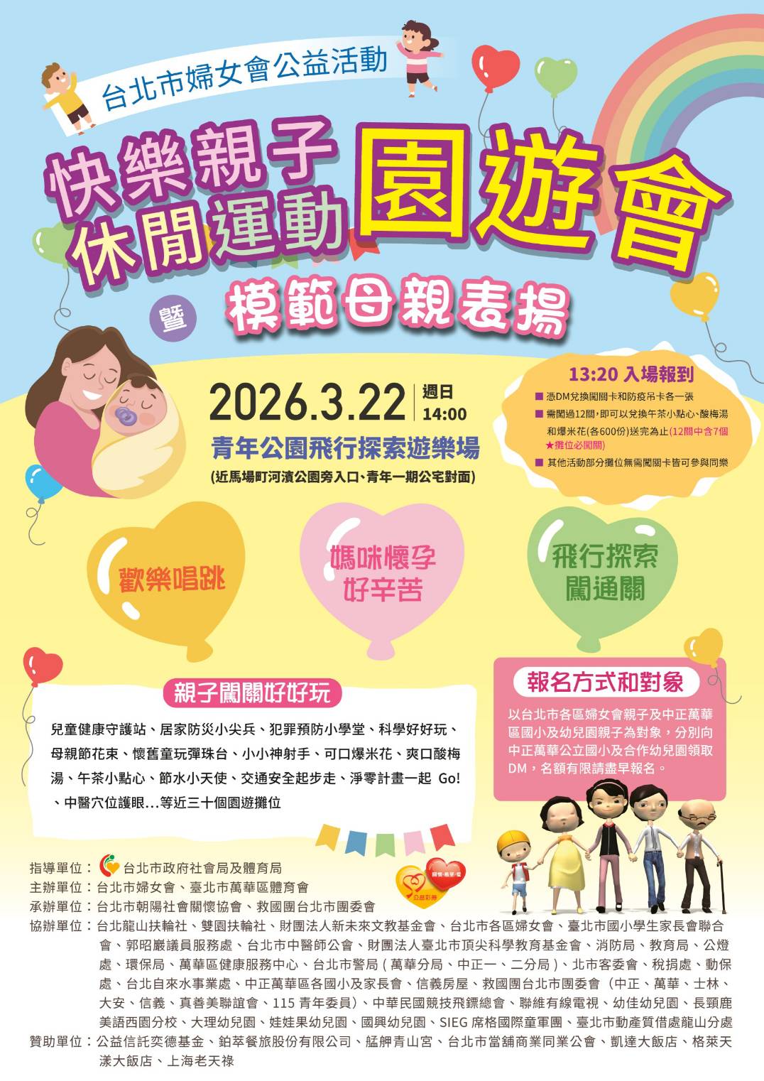 主旨:社團法人台北市婦女會主辦「快樂親子休閒運動園遊會暨模範母親表揚大會」參加辦法,鼓勵學生及家長踴躍報名參加。