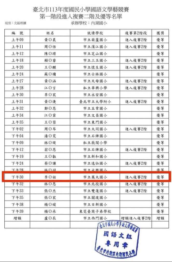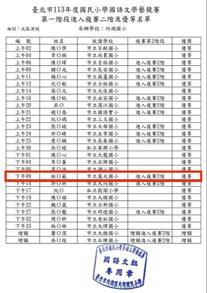 國語文演講和朗讀是高難度的競賽項目,萬大小選手能在七十多位優秀選手中脫穎而出,實在不容易。這一次,萬大國小也是中正萬華區唯一一所國語文演說和朗讀選手,雙雙進入第二階段複賽的學校呢!讚!