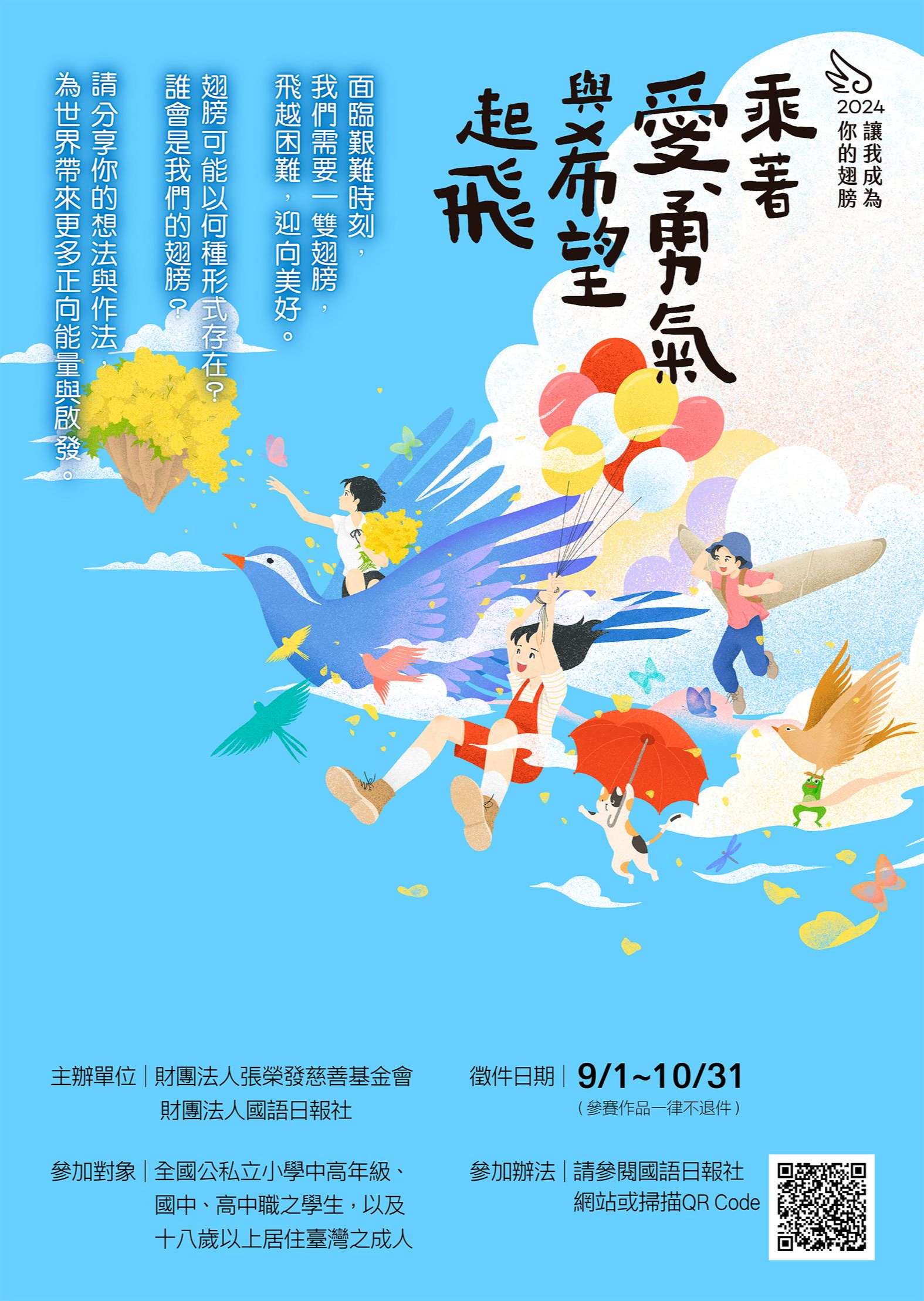 一、為了鼓勵正面助人的精神,強調社會連結與人際支持的重要,國語日報社與張榮發慈善基金會合辦「2024讓我成為你的翅膀──乘著愛、勇氣與希望起飛」徵件活動。