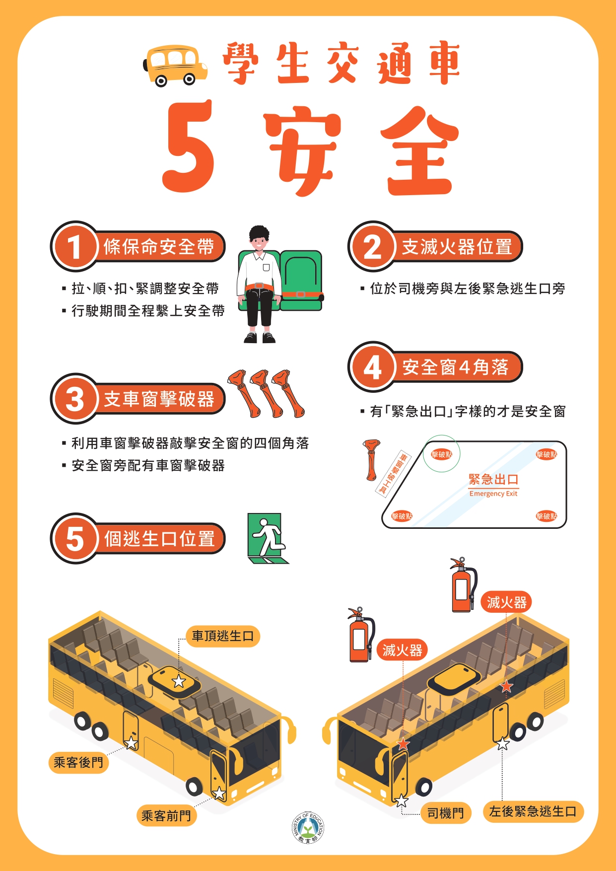 🚕 為提高學生搭乘交通車之安全意識及危機應變能力,教育 部委請國立臺灣師範大學製作學生交通車教育訓練教材、 教學影片及圖卡,供學校、短期補習班、兒童課後照顧服 務班及中心平時實施交通安全教育使用。🚕