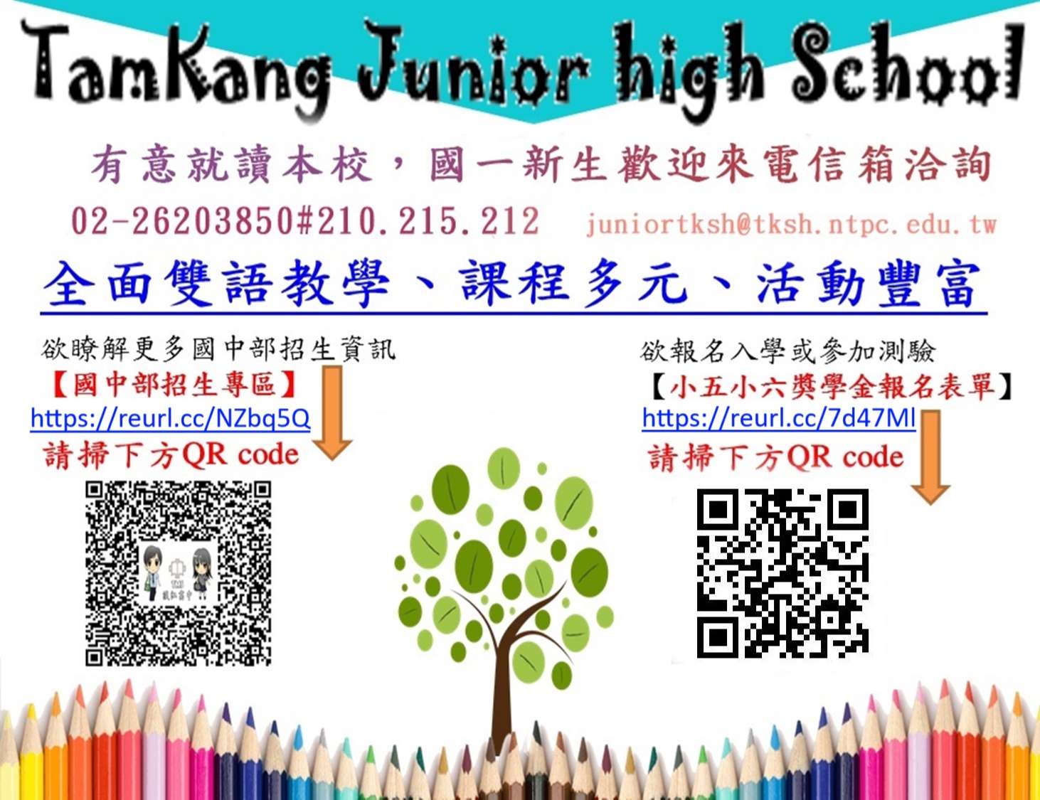一、新北市私立淡江高級中學附設國中部訂於114年 2月 28日(星期五)上午舉辦小五小六獎學金測驗暨家長說明會,歡迎小五、小六學生及家長報名參加。活動報名網址:https://reurl.cc/7d47Ml