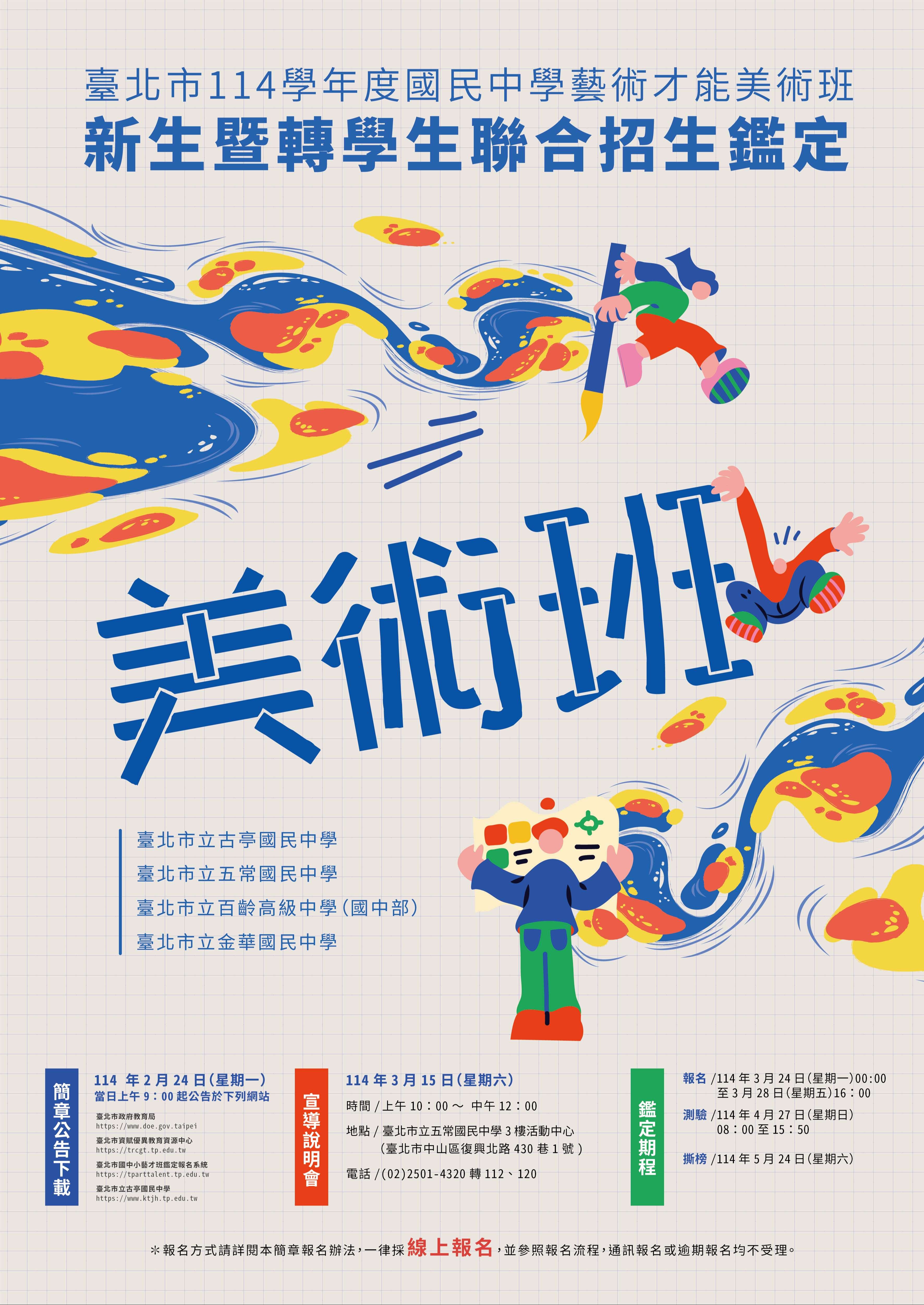 一、114學年度招生鑑定報名自114年3月24日(星期一)0: 00至 3月28日(星期五)16:00,3月15日宣導說明會,4月27日測驗,5月24日撕榜。