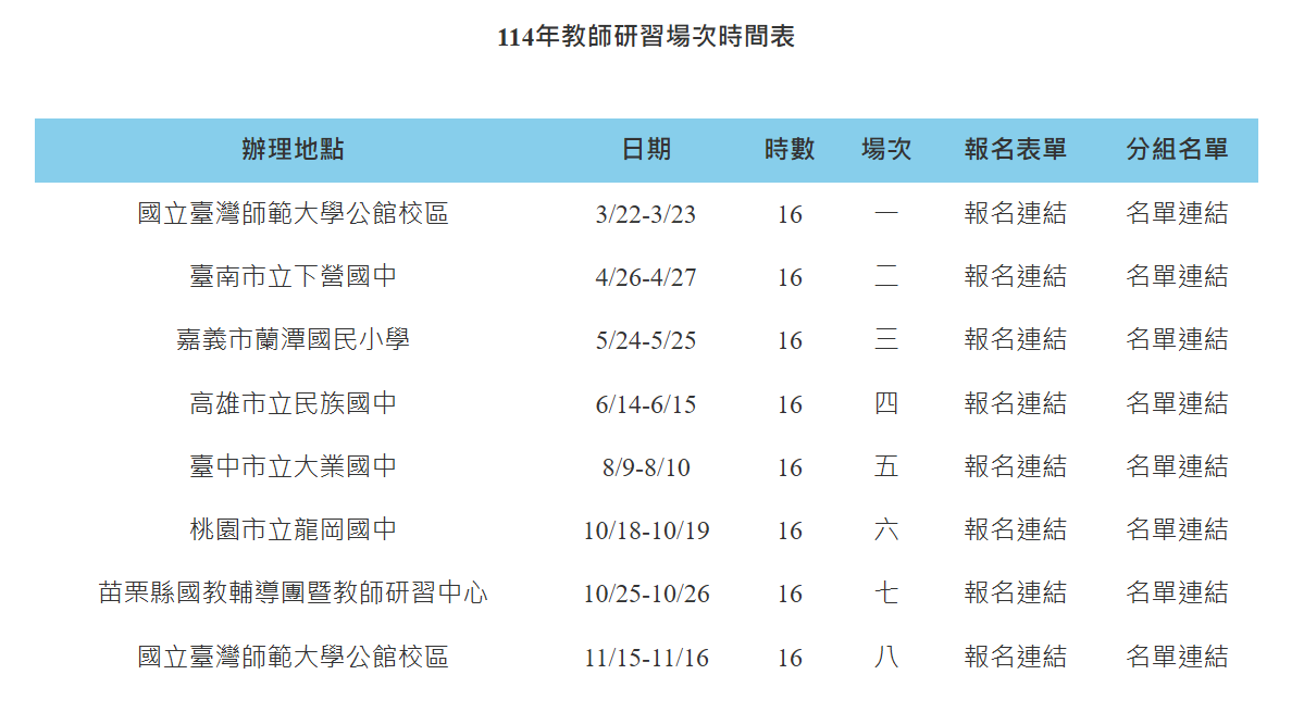 (八)第八場次師大2場:114年11月15日(星期六)至11月16日(星期日);研習地點:本校公館校區;報名連接:https://forms.gle/DkWFnpobuTFpkuQM7。