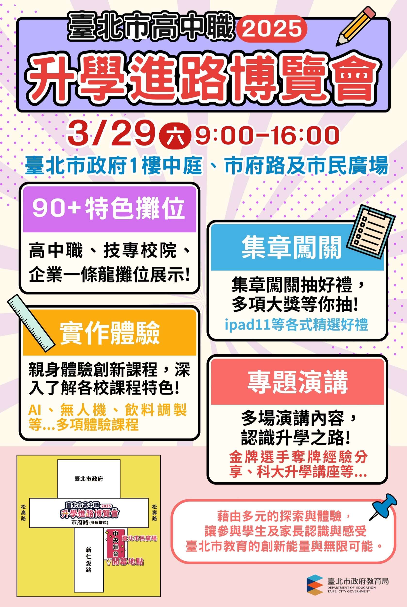 四、檢附臺北市2025年高中職升學進路博覽會宣傳海報、活動內容及攤位配置各1份,歡迎北北基桃國高中學生及家長來現場參加,瞭解臺北市優質高中職學校特色,詳情可參考本活動官方網站:https://sites.google.com/ymsh.tp.edu.tw/2025expo/。