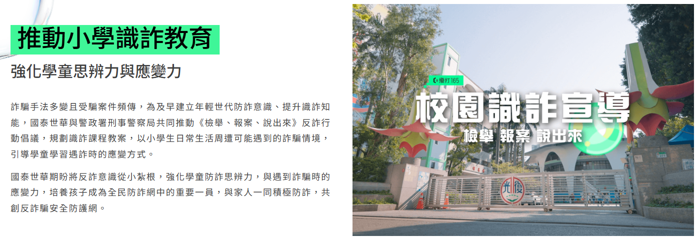 內政部警政署、教育部國民及學前教育署及國泰世華銀行前於114年3月26日簽署三方反詐合作意向書(MOU),並辦理「檢舉、報案、說出來」系列反詐活動。
