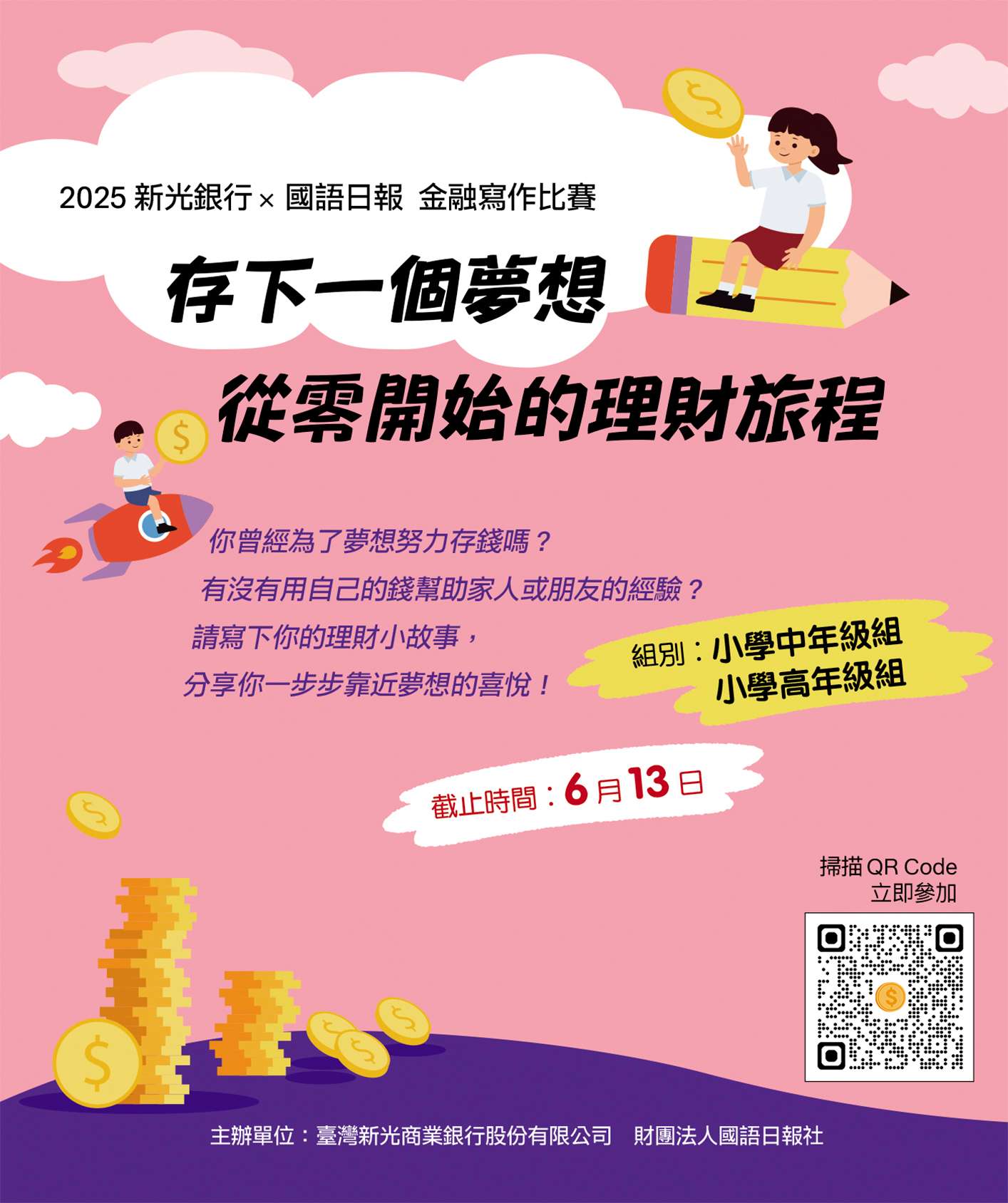 一、為提升兒童的財商素養,讓孩子了解金錢的價值與管理能 力,財團法人國語日報社與臺灣新光商業銀行共同舉辦「存下一個夢想 從 零開始的理財旅程」徵文活動。