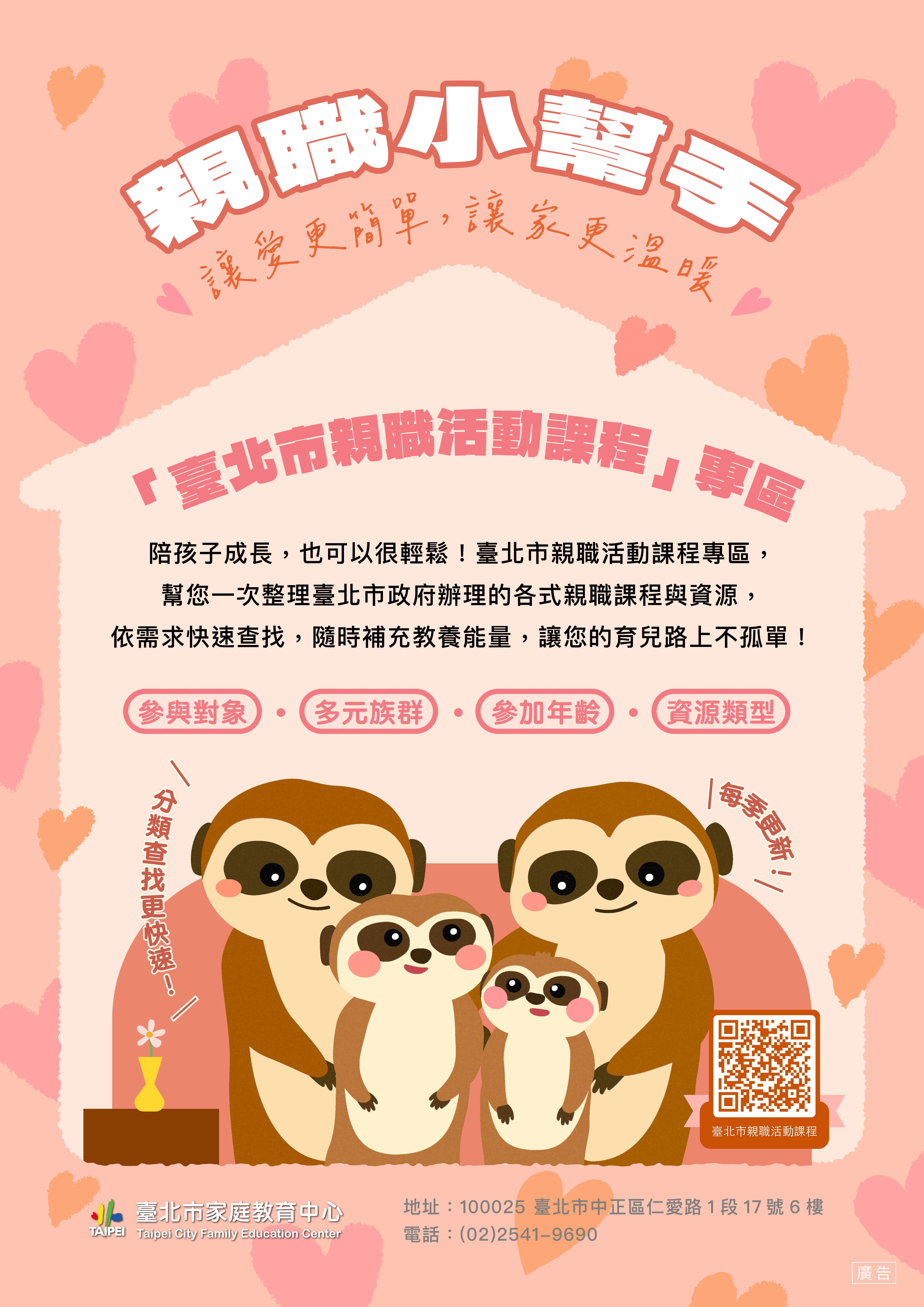 主旨:為協助家長掌握親職教育資源,臺北市家庭教育中心設置「臺北市親職活動課程專區」,每季更新臺北市政府辦理之親職課程與活動,並依參與對象與資源類型等分類,歡迎家長掃描QR Code查詢。